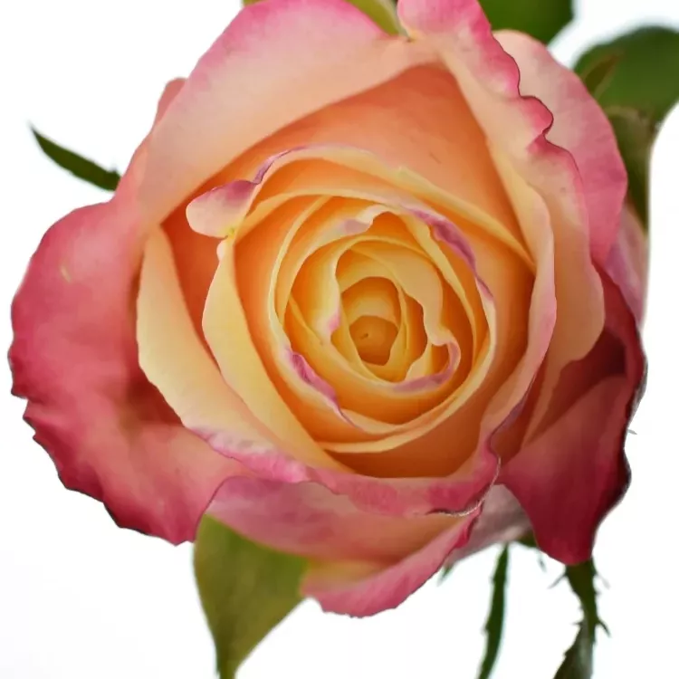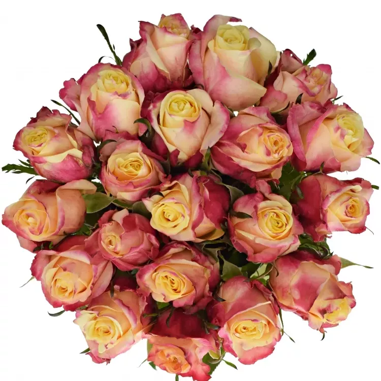 Růže, která vás okouzlí neokoukanou kombinací barev. Připomíná čerstvou letní broskev. Uvnitř šťavnatě žlutá a na okrajích broskvově růžová, která je podtržena výraznou tmavě růžovou linkou. Lahodí oku i duši, jen se zakousnout.