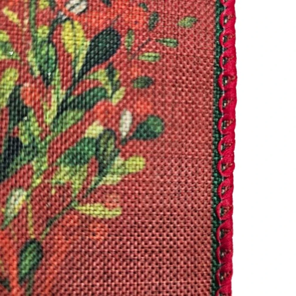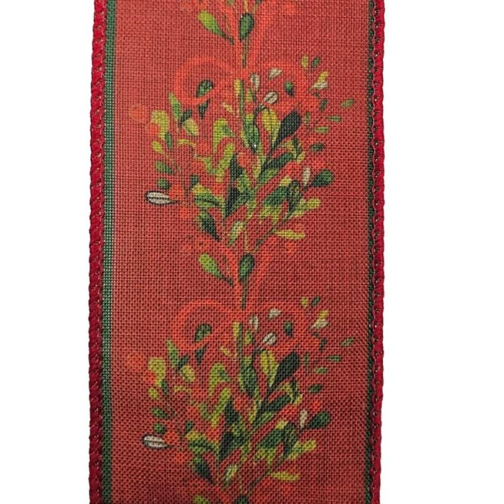 Stuha má nádherný design – je červená a potištěná motivem zelených větviček s červenými plody a mašlí, což ji činí dokonalou pro vánoční období i další slavnostní příležitosti.