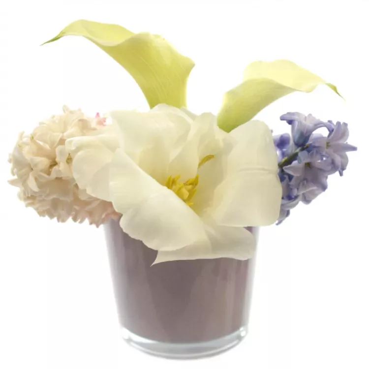 Nádherná skleněná miska v lila barvě podtrhne jemnost květinového aranžmá. Hodí se pro všechny řezané květiny, nejlepšího efektu dosáhnete s karafiáty, růžemi, kalou, chryzantémou nebo jejich mixem.