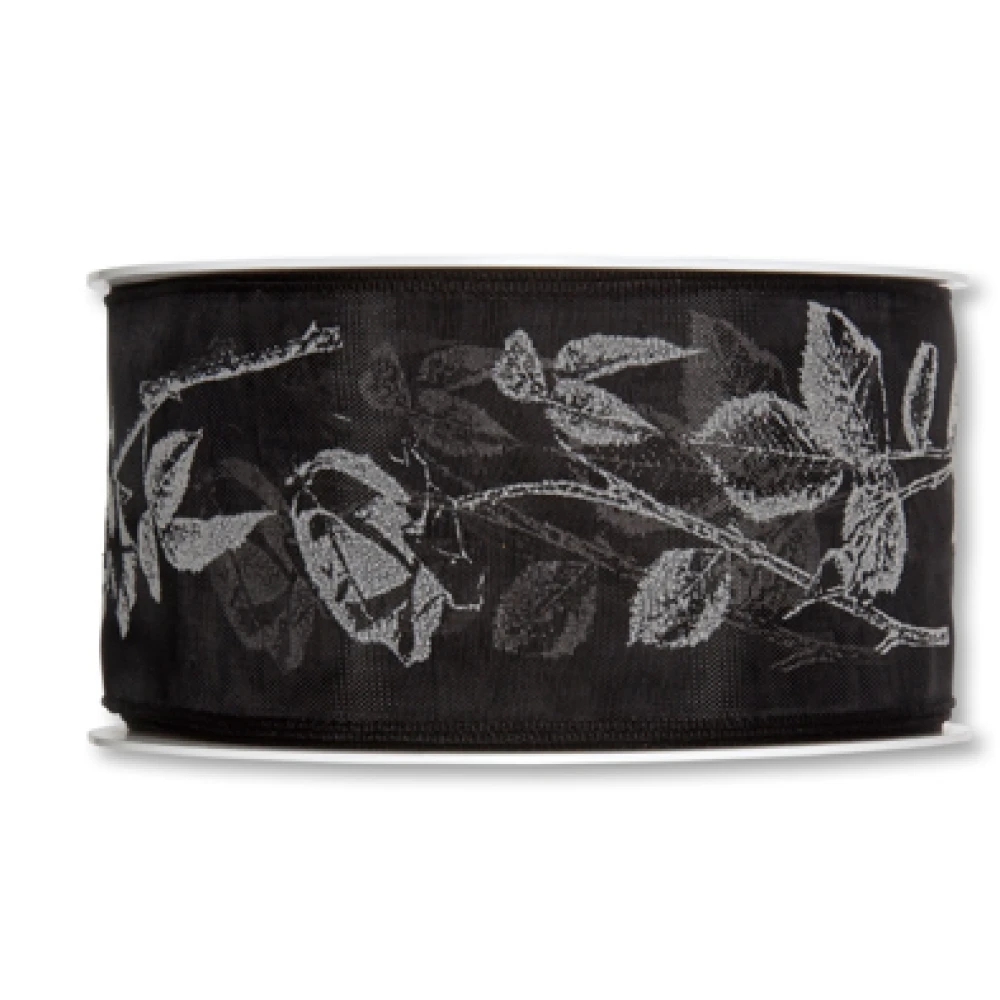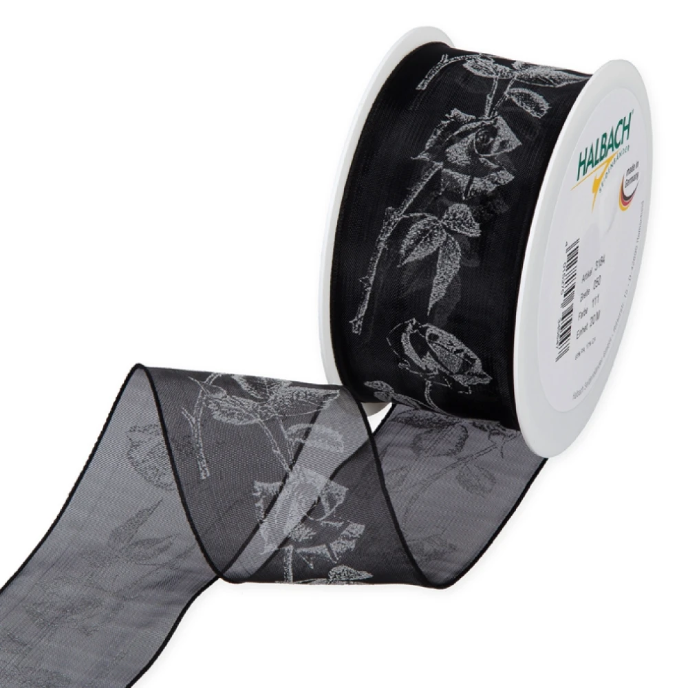 - Smuteční organza s potiskem růží černá tmavá 50mm x 20m