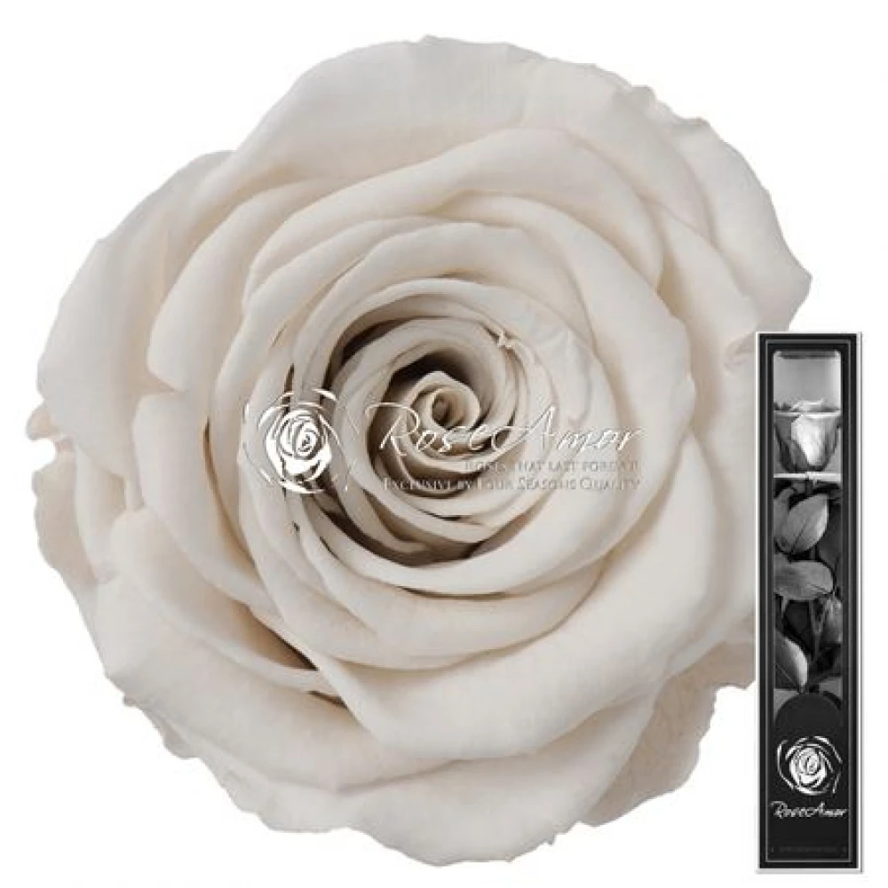 Stabilizovaná bílá růže na stonku v délce 30 cm od Rose Amor je vrcholným výrazem elegance a dlouhodobé krásy. Růže prošla procesem stabilizace, který umožňuje uchovat její přirozenou svěžest a formu bez potřeby zálivky a denní péče, a tak zůstává krásná po dlouhou dobu.