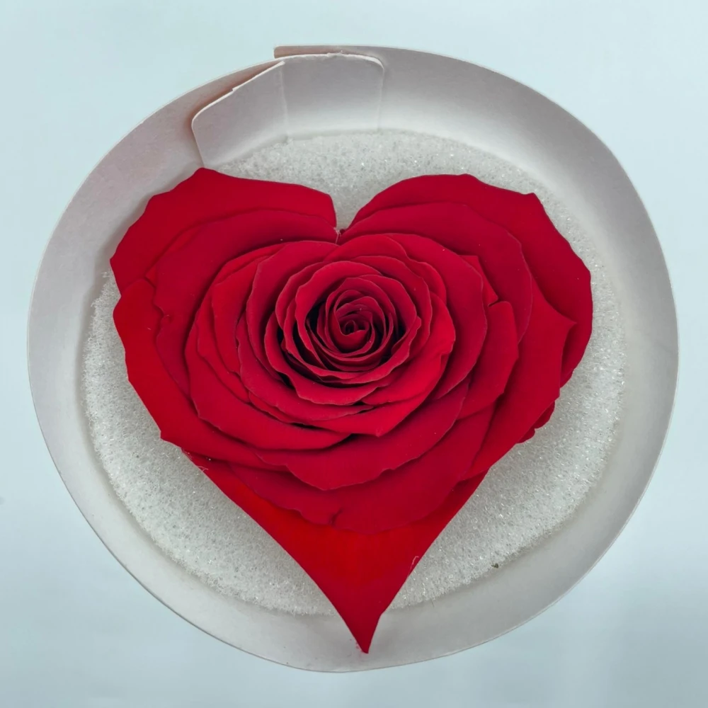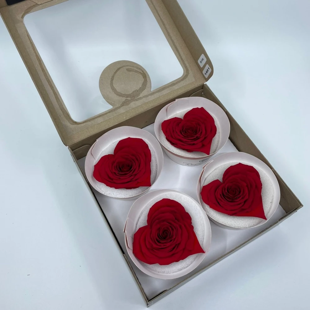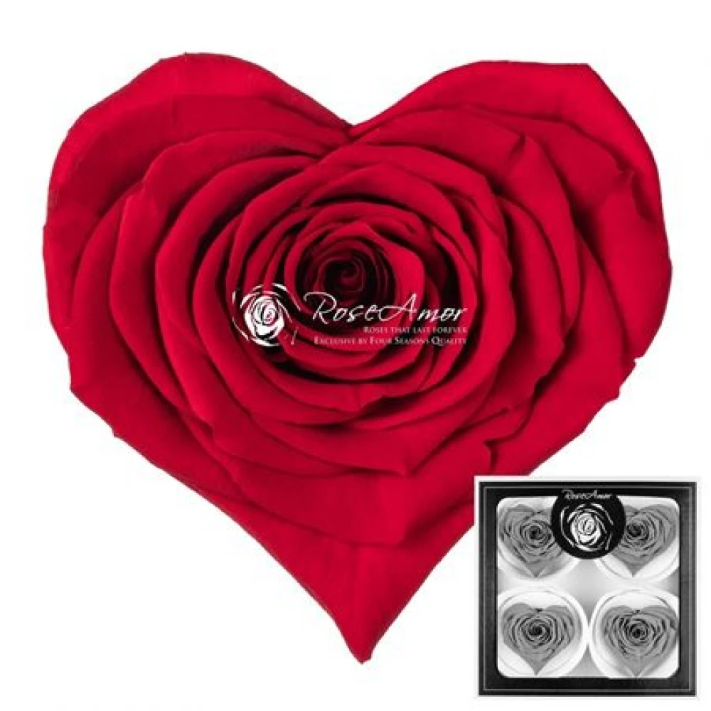 Stabilizovaná červená růže tvaru srdce 4ks od Rose Amor, je mistrovským kouskem floristického umění, zachycujícím věčnou krásu a význam lásky. Každý exemplář této sady je pečlivě ošetřen pro dlouhotrvající život bez potřeby vody nebo další péče.