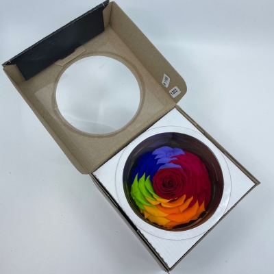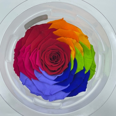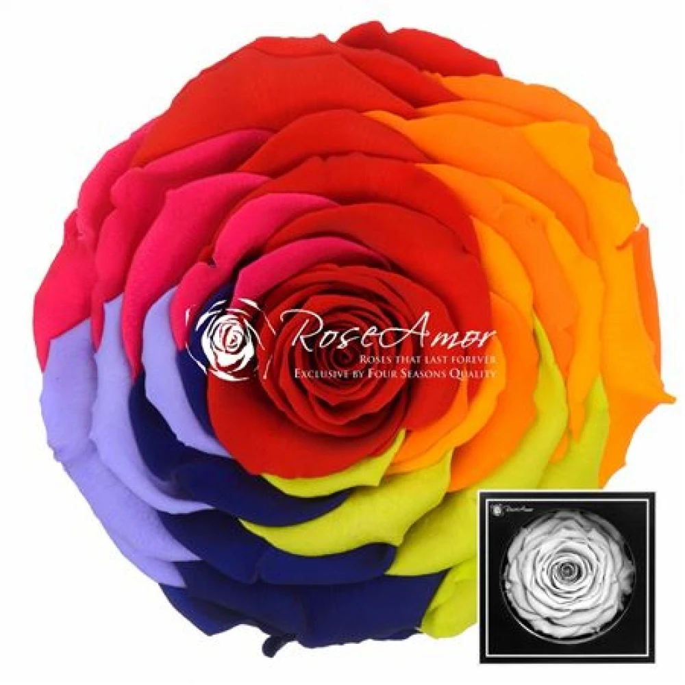 Stabilizovaná duhová růže XXL v elegantní krabičce od Rose Amor je mistrovské dílo, které představuje vrchol květinářského umění. Každá růže je pečlivě vybrána a zpracována pomocí inovativní techniky stabilizace, což jim umožňuje zachovat svůj čerstvý vzhled a bohatost barev po dlouhé období bez nutnosti zalévání nebo jiné péče.