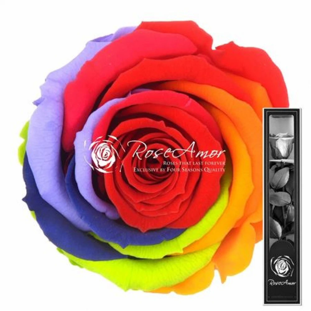 Stabilizovaná duhová růže Rose Amor přináší explozi barev na jediném stonku. Ručně upravená růže prochází pečlivým procesem, kdy každý lístek je individuálně zbarven pro dosažení tohoto úchvatného vzhledu. Díky stabilizaci si zachovává svůj vzhled bez potřeby vody nebo speciální péče po mnoho let.