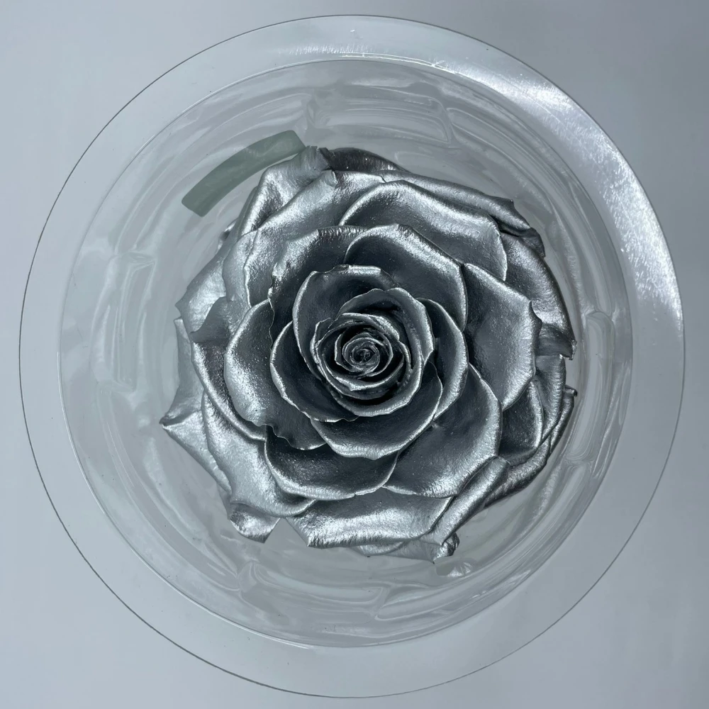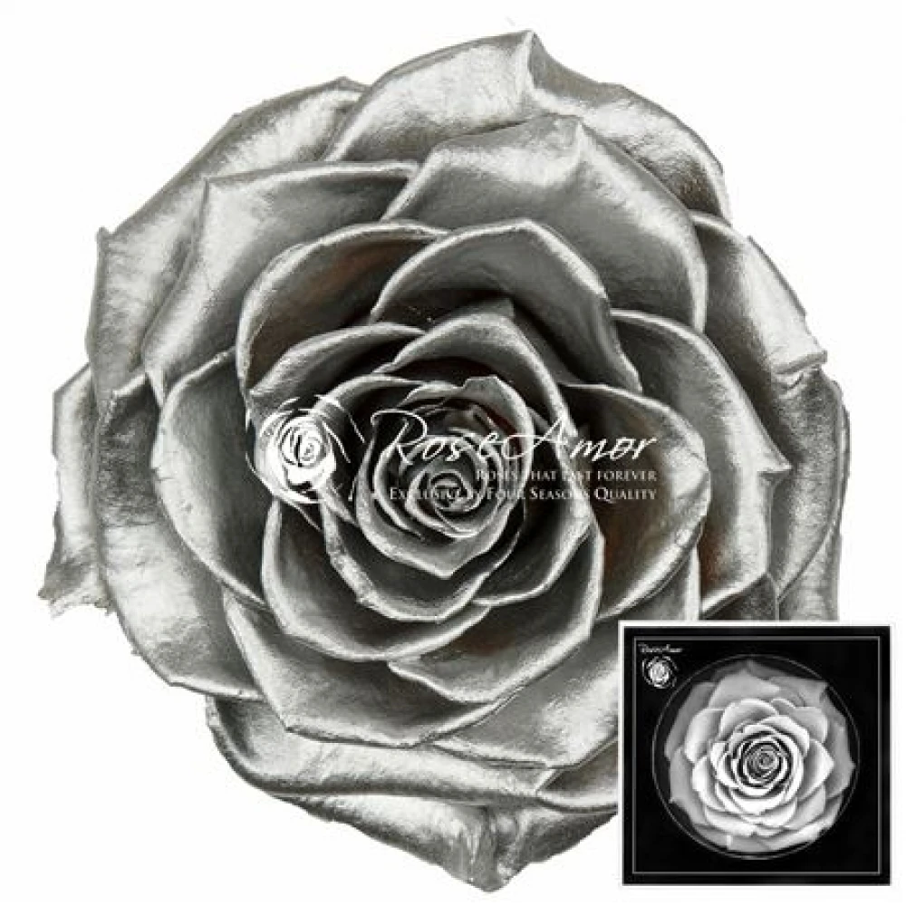 Stabilizovaná stříbrná růže XXL v luxusní krabičce od Rose Amor představuje vrchol elegance a inovace ve floristice. Díky šetrnému procesu stabilizace si zachovává svoji dokonalou formu a barvu po dlouhá léta, aniž by potřebovala jakoukoliv péči.