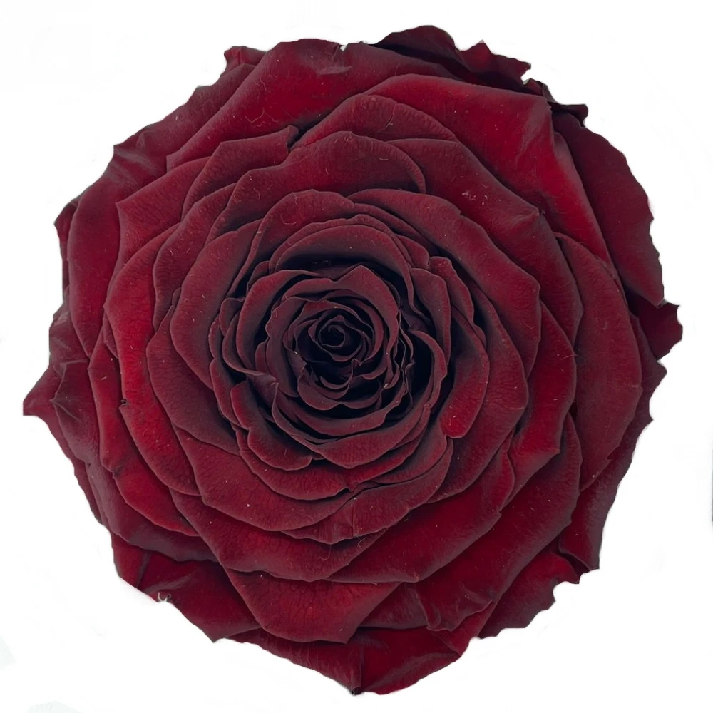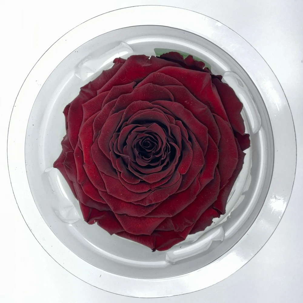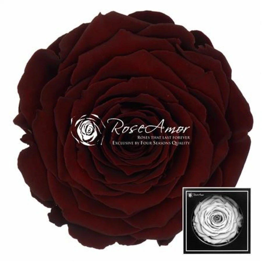 Temně červená stabilizovaná růže XXL v elegantní krabičce od Rose Amor, upravená inovativní technikou stabilizace, aby uchovávala svoji nádhernou formu a barvu po dlouhá léta, poskytuje bezproblémový dekorativní prvek s minimální údržbou.