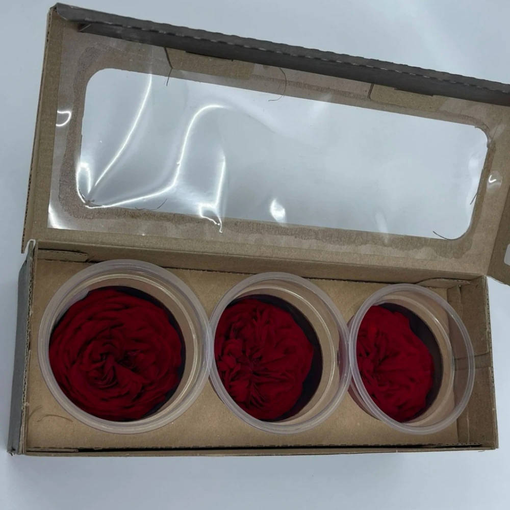 Stabilizované sametově červené zahradní růže v krabičce 3ks