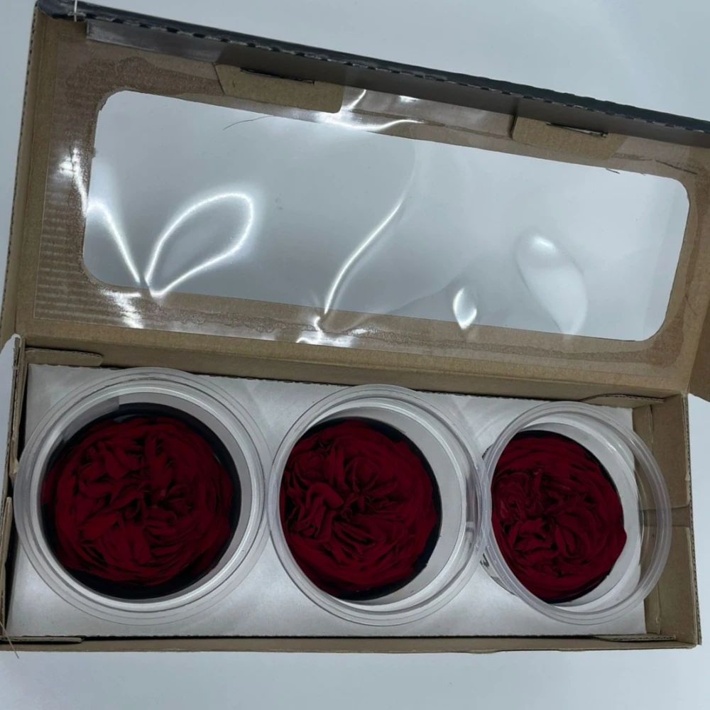 Stabilizované granátově červené zahradní růže v krabičce 3ks