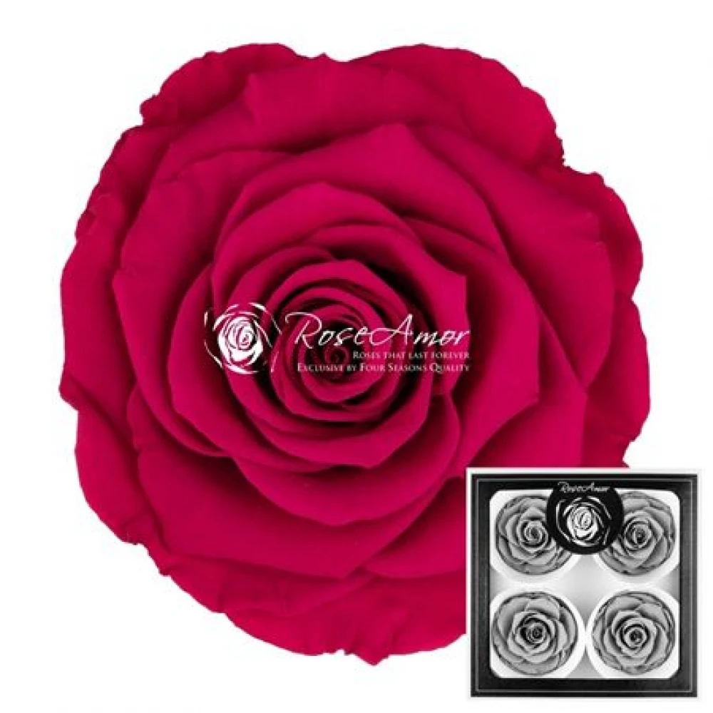 Stabilizované burgundsky červené růže v krabičce po čtyřech kusech od Rose Amor jsou skvostem mezi stabilizovanými květinami. Díky preciznímu procesu stabilizace zůstávají tyto růže nádherné a čerstvé roky, aniž by potřebovaly vodu či zvláštní péči.