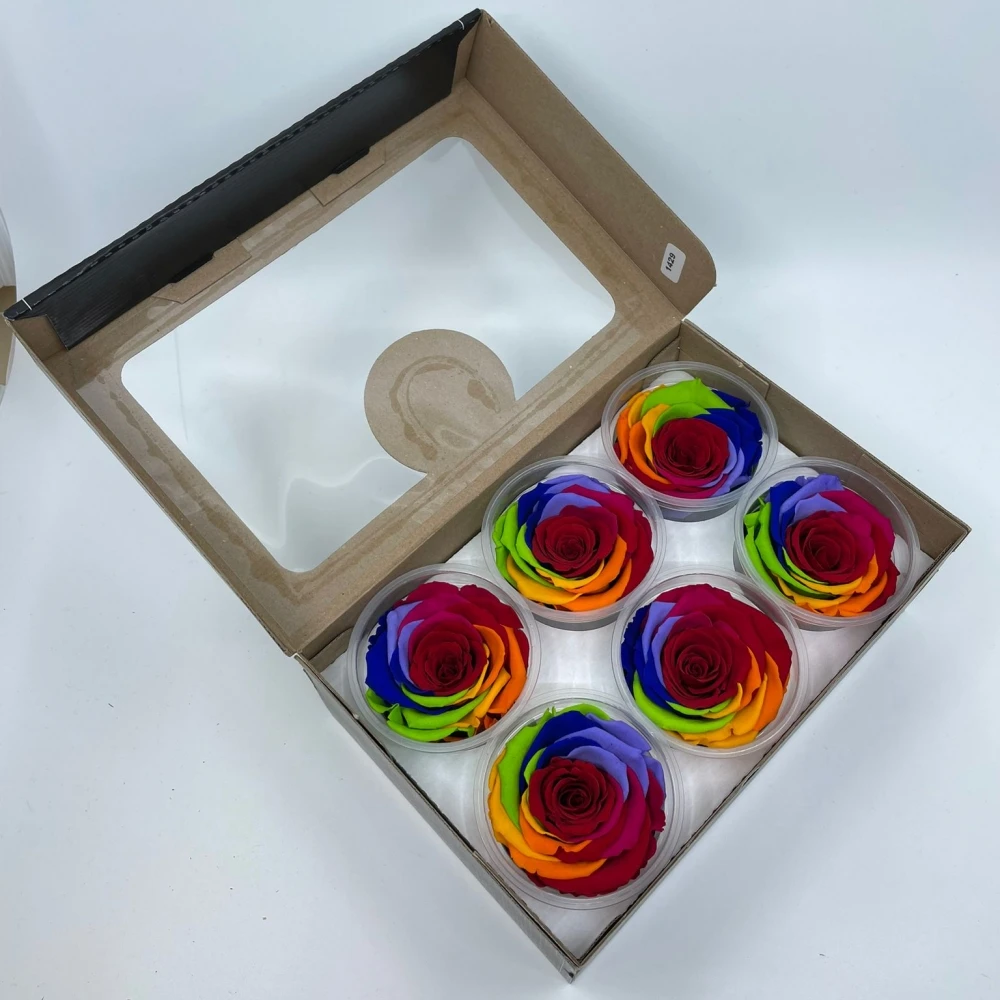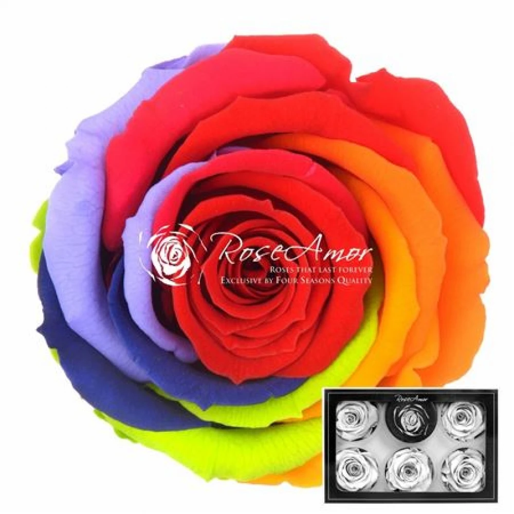 Stabilizované duhové růže XL v krabičce po šesti kusech od Rose Amor jsou průkopnickým produktem, který ztělesňuje nejen technický pokrok ve stabilizaci květin, ale také radostnou krásu přírody. Každá růže byla pečlivě ošetřena stabilizací k zachování její dokonalosti po dlouhé období, aniž by potřebovaly jakoukoliv péči nebo vodu.