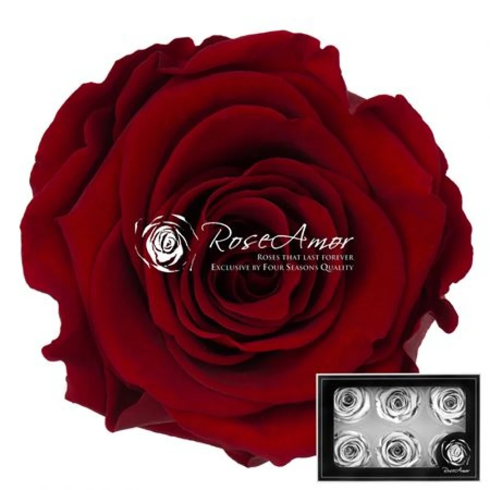 Stabilizované granátově červené růže v krabičce po šesti kusech od Rose Amor jsou vybrány, aby vám přinesly krásu, která vydrží věčně. Tento set růží je pečlivě zachován pomocí speciální techniky, která udržuje jejich přirozenou strukturu a hloubku barvy.