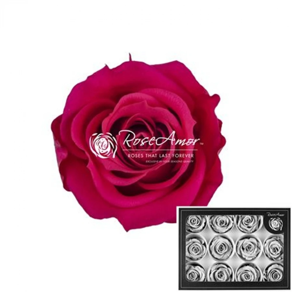 Karmínově červené růže od Rose Amor, prezentované v elegantní krabičce M, představují trvalou krásu. Těchto dvanáct stabilizovaných květů je zpracováno unikátní technikou stabilizace, která zachová jejich přirozenou strukturu a barvu, zajišťující dlouhodobou svěžest bez potřeby zalévání.