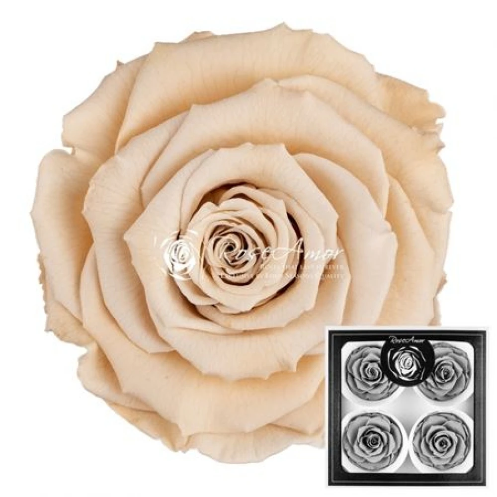 Stabilizované krémové růže od Rose Amor jsou synonymem elegance a krásy. Díky pečlivému procesu stabilizace si zachovávají svůj kouzelný vzhled a svěžest bez nutnosti vody či pravidelné péče. Prezentované v exkluzivní krabičce po čtyřech kusech, jsou ideální jako dekorace nebo dárek.