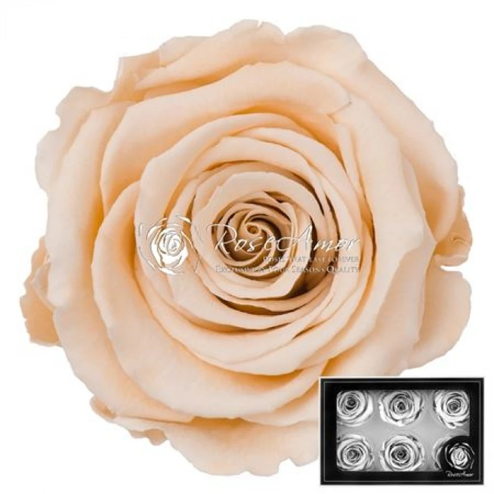 Stabilizované krémové růže v krabičce po šesti kusech od Rose Amor jsou mistrovským dílem přírodní krásy, zachované v její nejčistší formě. Díky inovativní technologii stabilizace, zůstávají tyto květy dlouhodobě svěží bez potřeby vody nebo údržby.