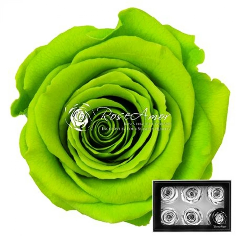 Stabilizované limetkově zelené růže v krabičce po šesti kusech, které představuje společnost Rose Amor, jsou mistrovským dílem živosti a trvalé krásy. Díky šetrnému procesu stabilizace, si tyto růže zachovávají svůj svěží vzhled bez potřeby další péče či vody, proměňující každý prostor v oázu klidu a přirozenosti.
