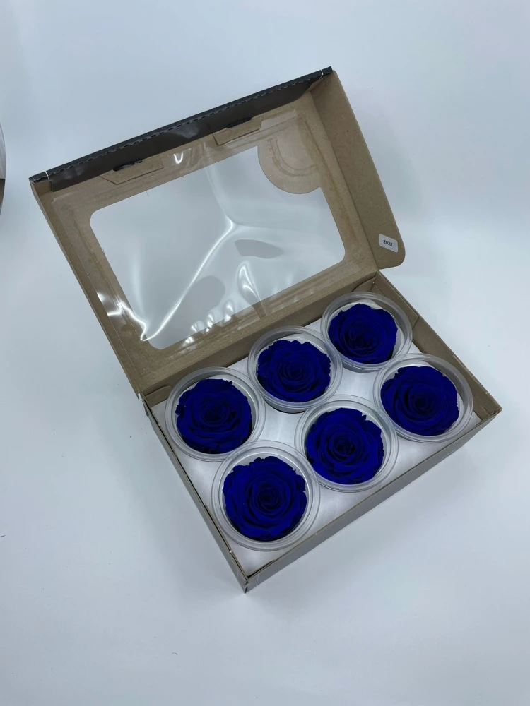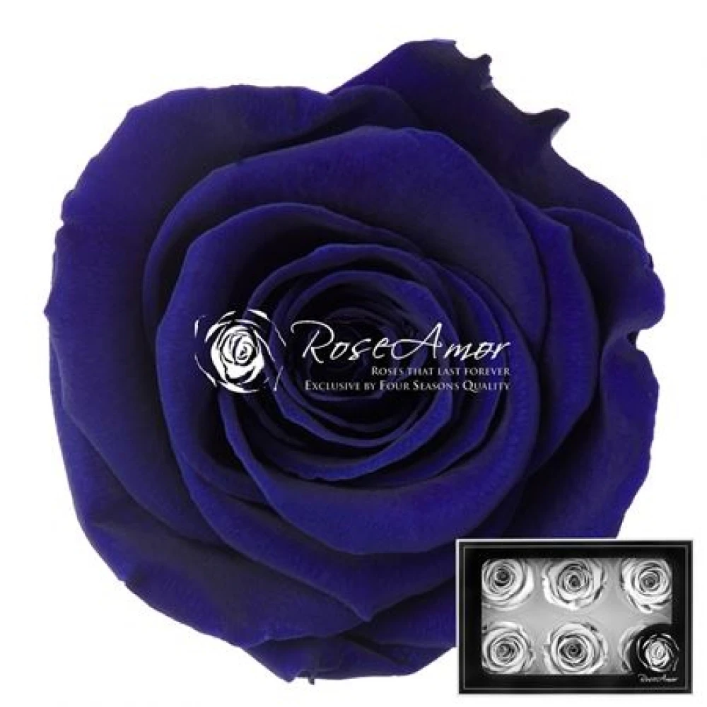 Stabilizované modré růže v krabičce 6ks od Rose Amor jsou mistrovským dílem trvanlivosti a designu. Růže jsou zpracovány pomocí speciální metody stabilizace, která zachová jejich přirozenou texturu a intenzivní barvu po dlouhá léta.