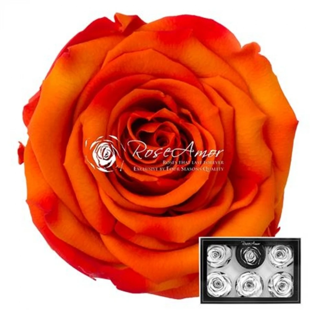 Stabilizované oranžové žíhané růže o velikosti XL v elegantní krabičce po 6 ks od Rose Amor jsou mistrovským dílem procesu stabilizace, kde každý květ zachovává svou živost a texturu po dlouhé roky bez potřeby údržby.