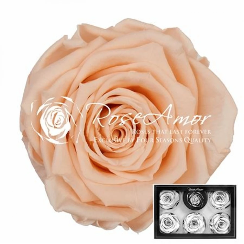 Stabilizované pudrově oranžové růže o velikosti XL v elegantní krabičce po 6 ks od Rose Amor přinášejí půvab a jemnost do každého prostředí, ve kterém jsou umístěny. Sada růží, uchovávajících svou svěží texturu a barvu díky pečlivému stabilizačnímu procesu, je symbolem trvalosti a elegance.
