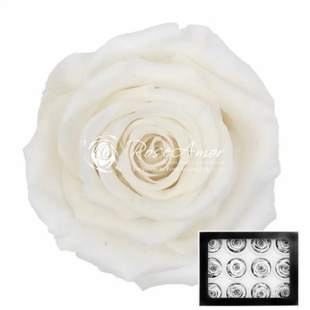 Stabilizované sněhově bílé růže v elegantní krabičce po dvanácti kusech od Rose Amor jsou symbolem čistoty a nevinnosti. Speciálně stabilizované, tyto růže udržují svou krásu a strukturu dlouhodobě, aniž by vyžadovaly jakoukoliv péči.