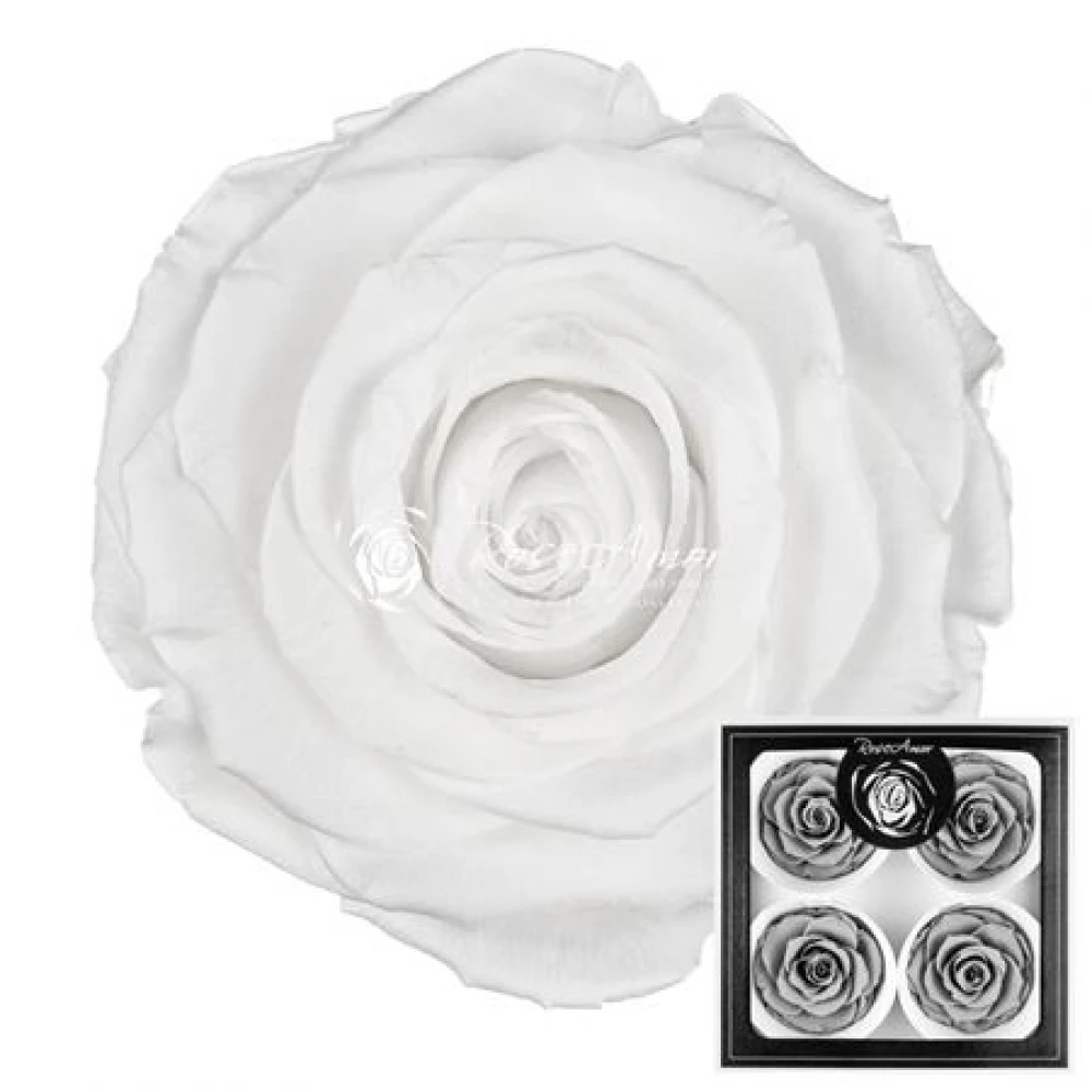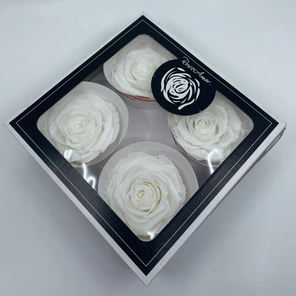Stabilizované sněhově bílé růže v krabičce 4ks od Rose Amor představují vrchol elegance a sofistikovanosti. Díky speciální technologii stabilizace si uchovávají svou čistotu a nádheru bez nutnosti zalévání či další péče, což je činí dokonalou volbou pro každou příležitost.