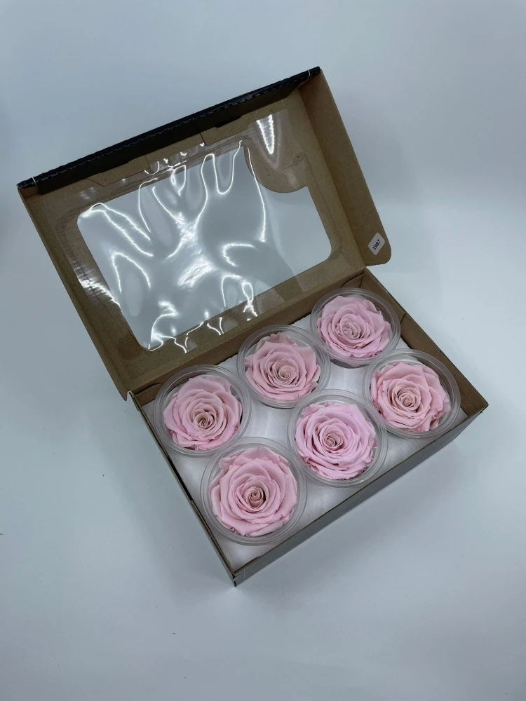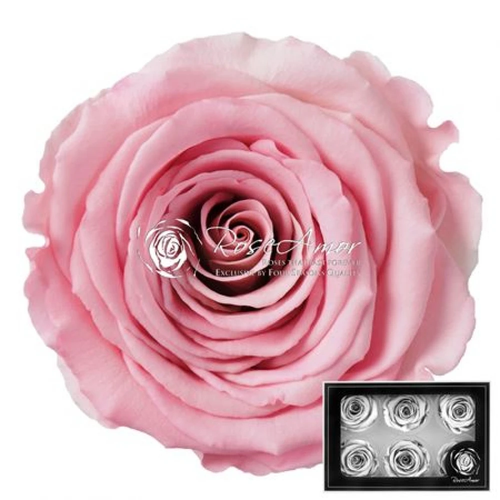 Sada šesti stabilizovaných světle růžových růží Rose Amor je mistrovským dílem dlouhotrvající krásy. Zachycené v momentě nejvyššího květu, tyto růže udržují svůj kouzelný vzhled po mnoho let.