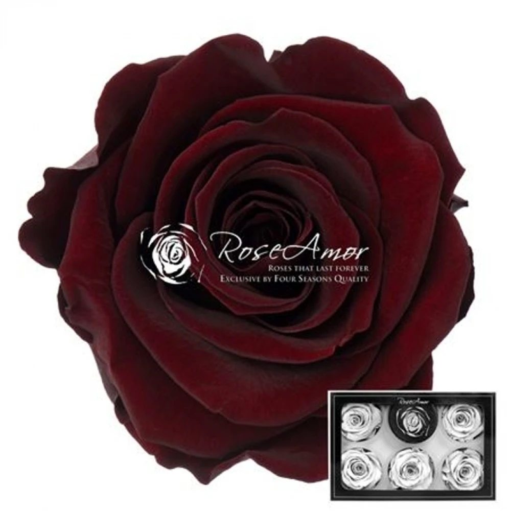 Stabilizované temně červené růže o velikosti L, elegantně uložené v krabičce po šesti kusech od Rose Amor, představují odvahu a hlubokou vášeň. Unikátní metoda stabilizace uchovává živý vzhled a sametovou strukturu každého květu, což umožňuje těmto klenotům zůstat nádhernými po mnoho let bez nutnosti jakékoliv péče.