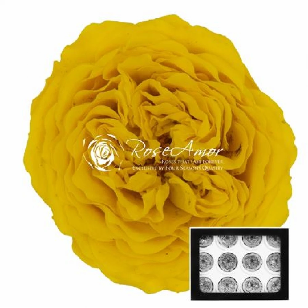 Stabilizované žluté růže v krabičce 12ks od Rose Amor jsou dokladem řemeslného umu a inovace, nabízejí dlouhotrvající krásu a majestátní vzhled bez potřeby péče.