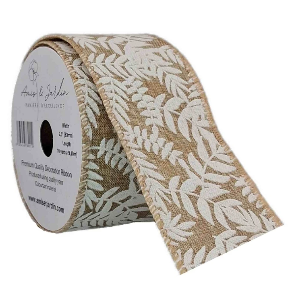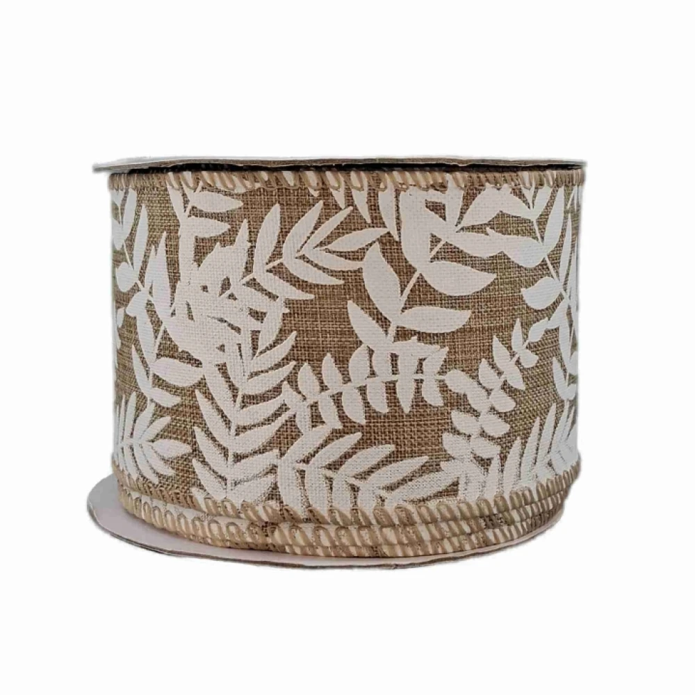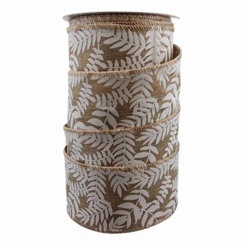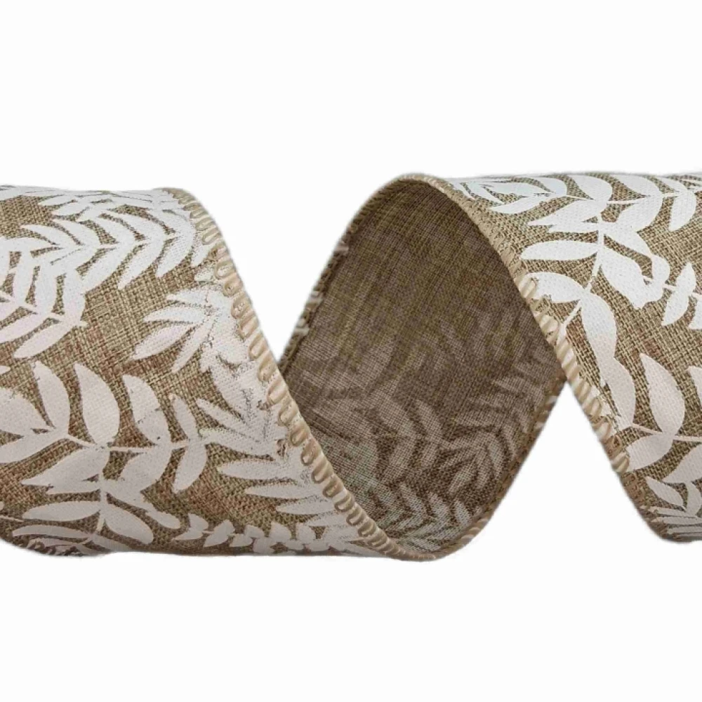 Stuha jutová s drátkem béžová přírodní listy 9.1 m
