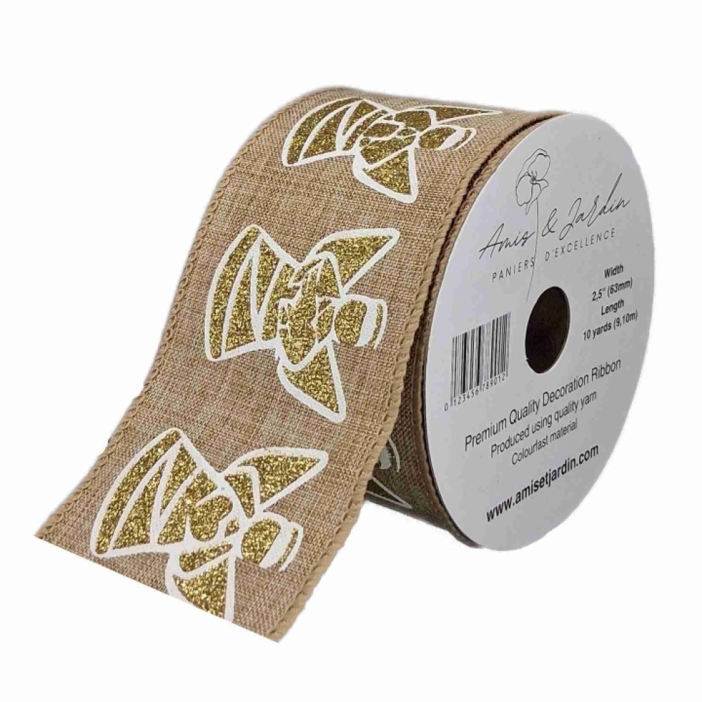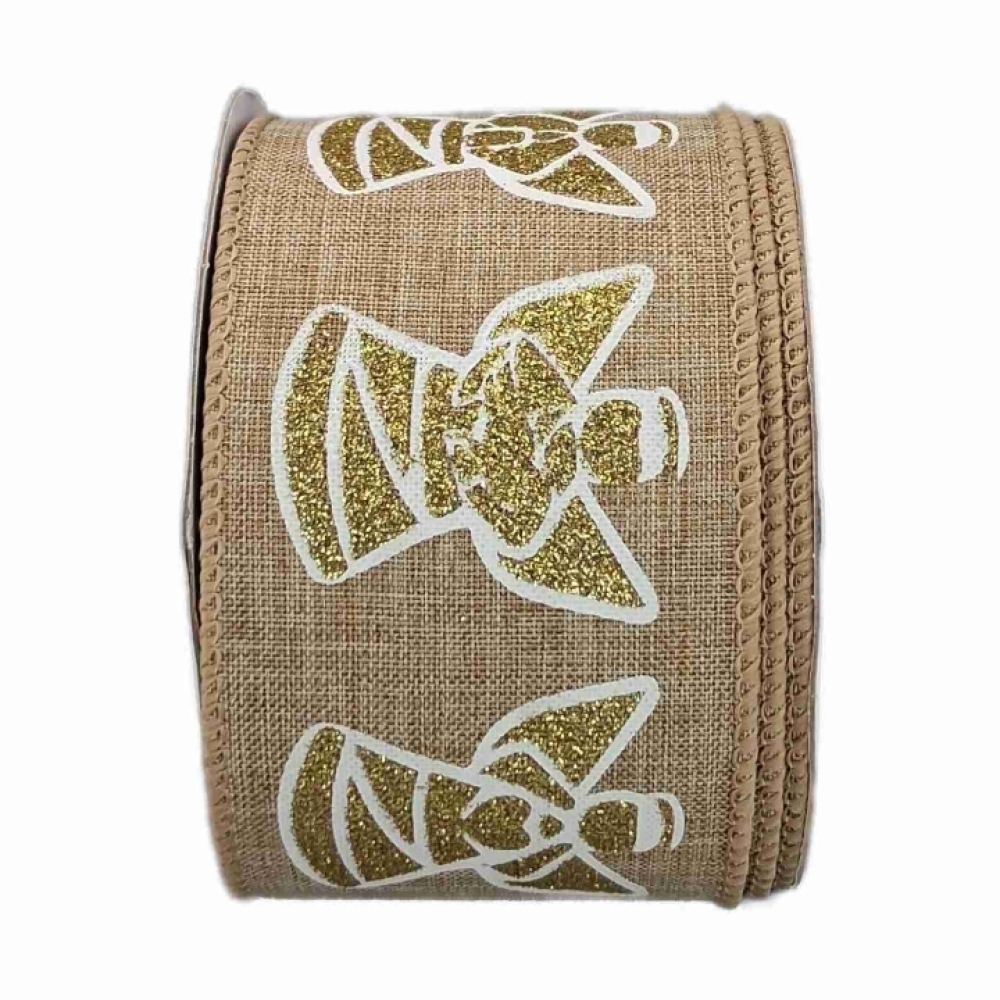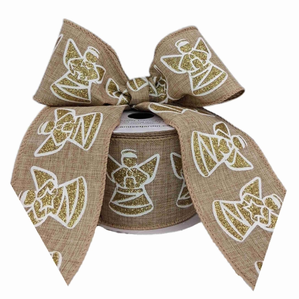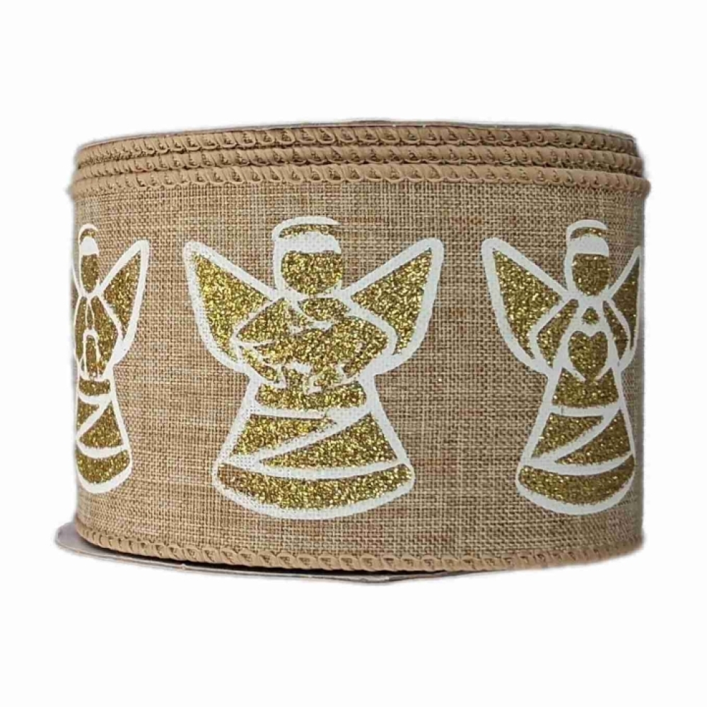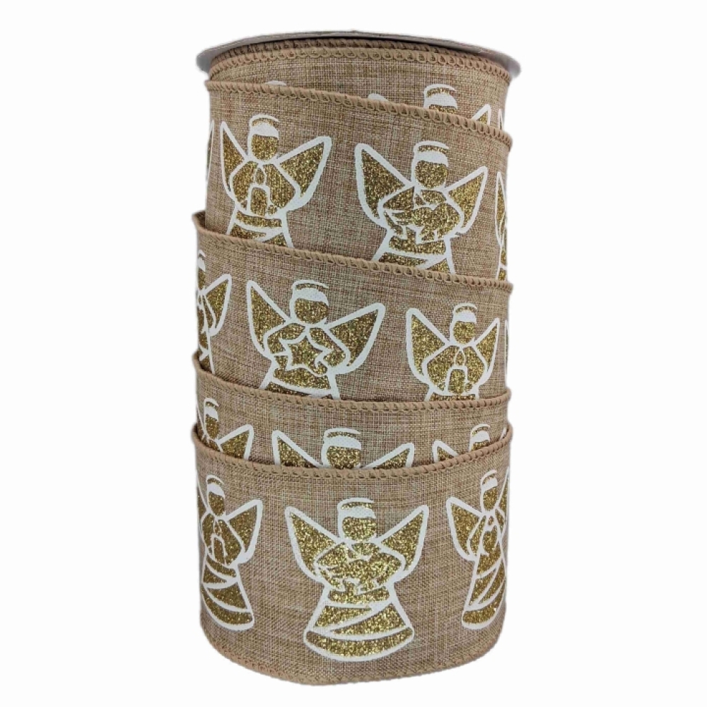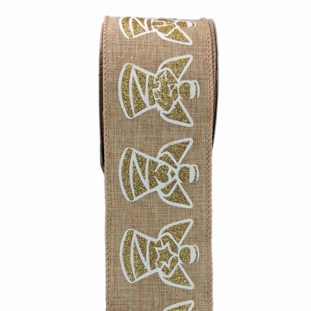 Přírodní béžová stuha s vánočním motivem andělů, zlaté třpytky dodávají elegantní vzhled.