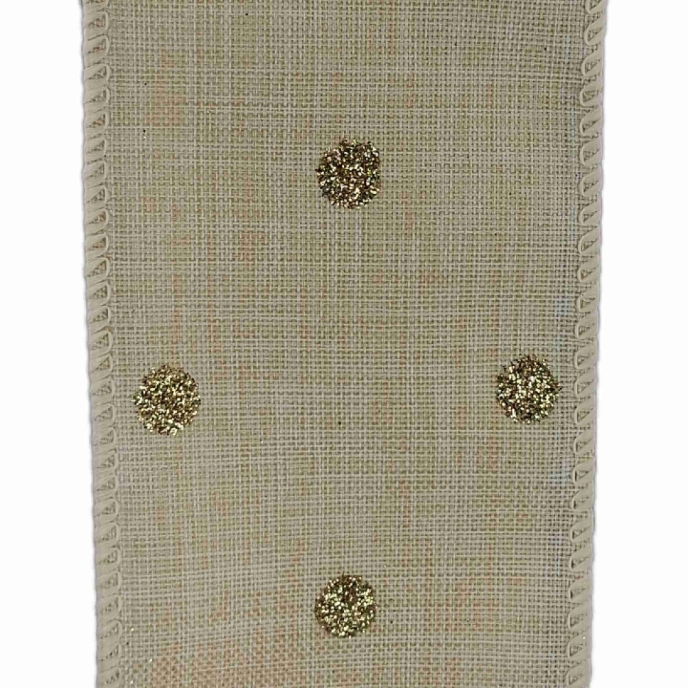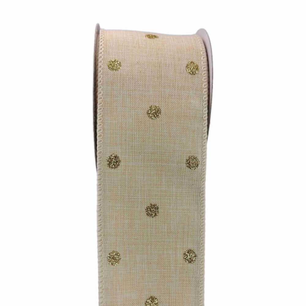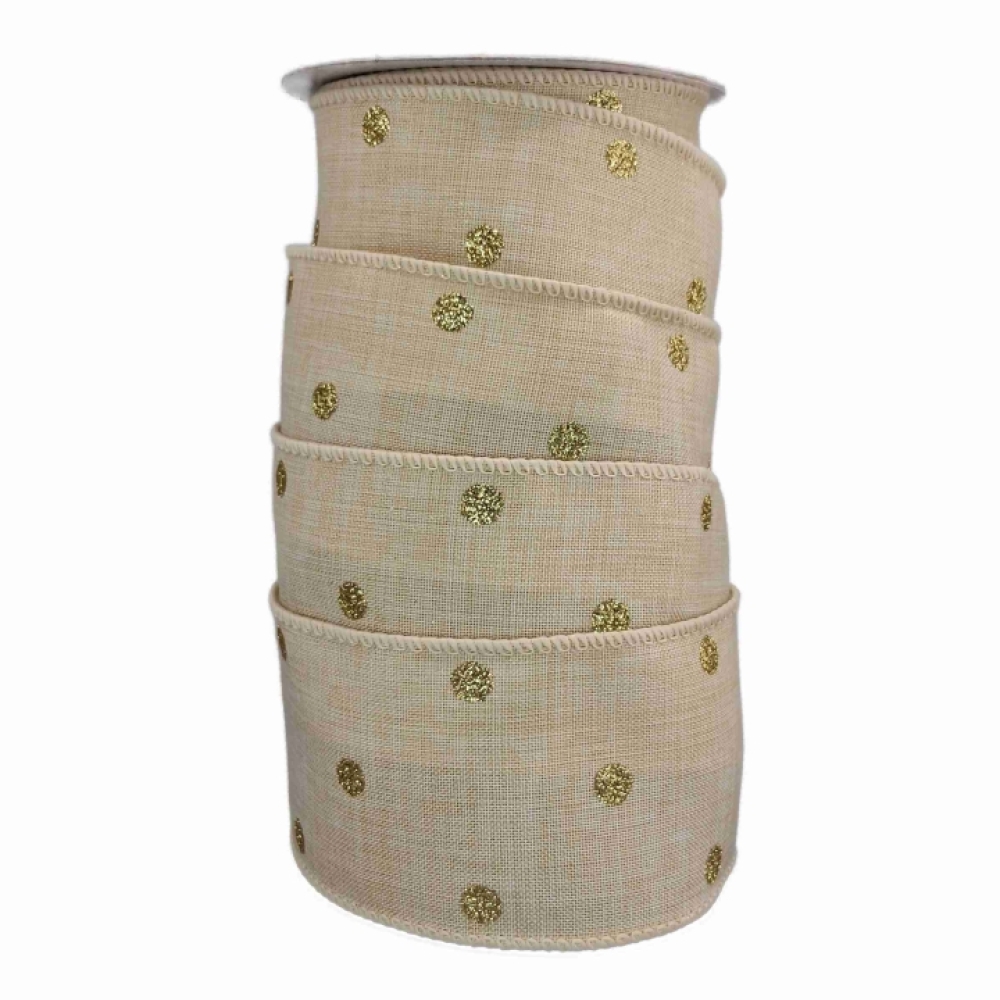Jemně béžová stuha se zlatými třpytivými puntíky, elegantní a univerzální pro různé dekorace.