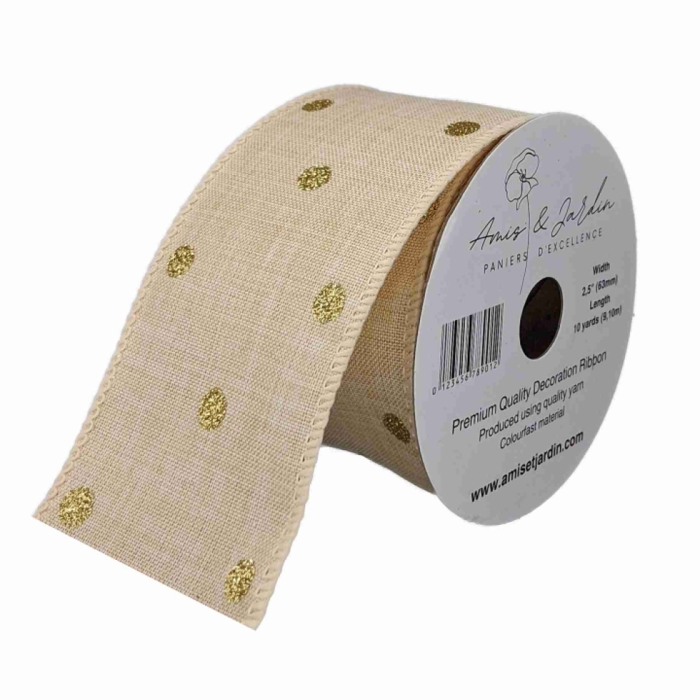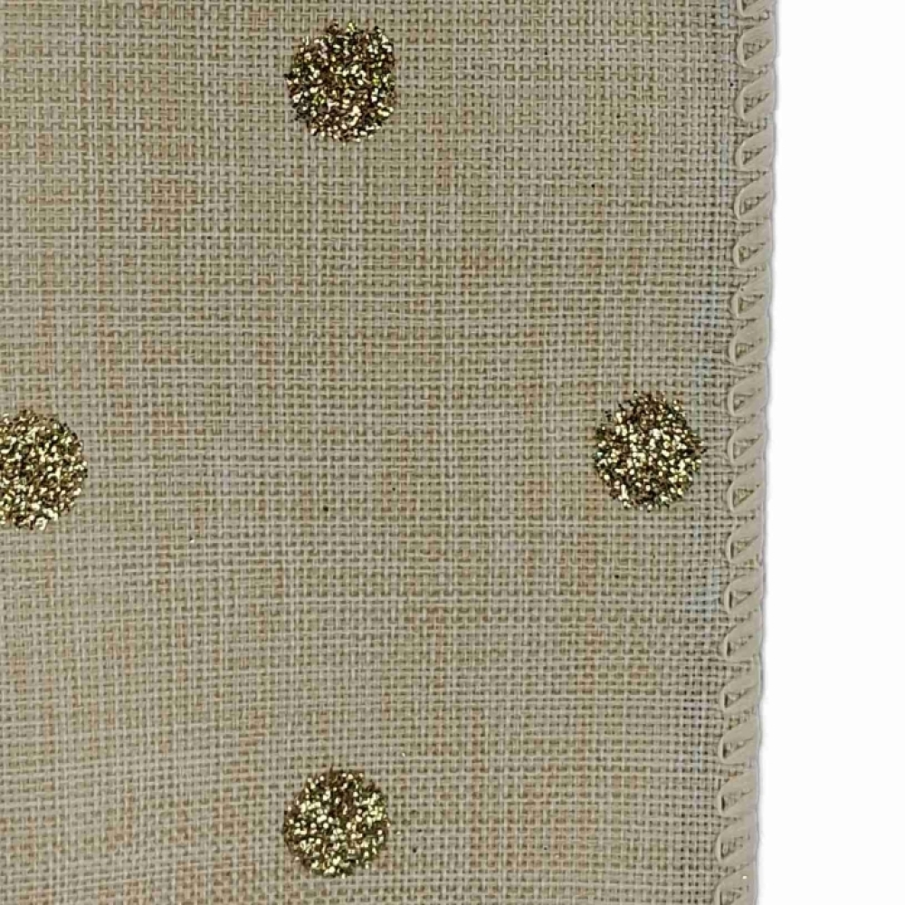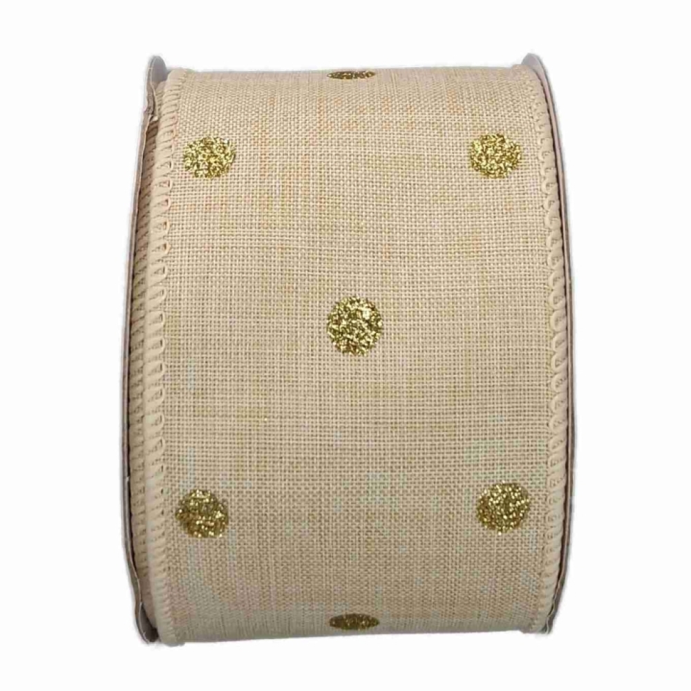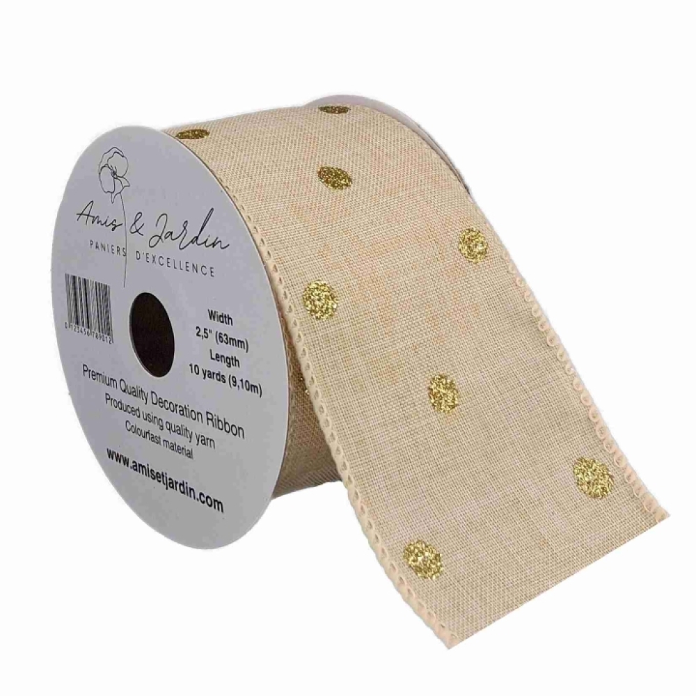 Jemně béžová stuha se zlatými třpytivými puntíky, elegantní a univerzální pro různé dekorace.