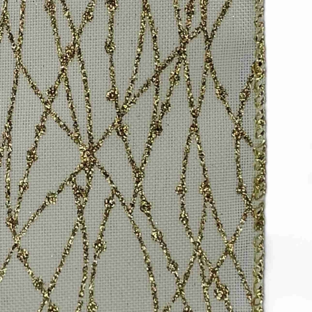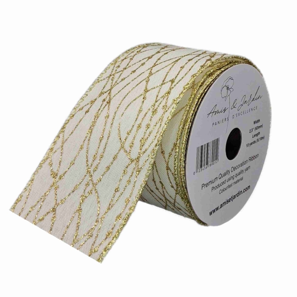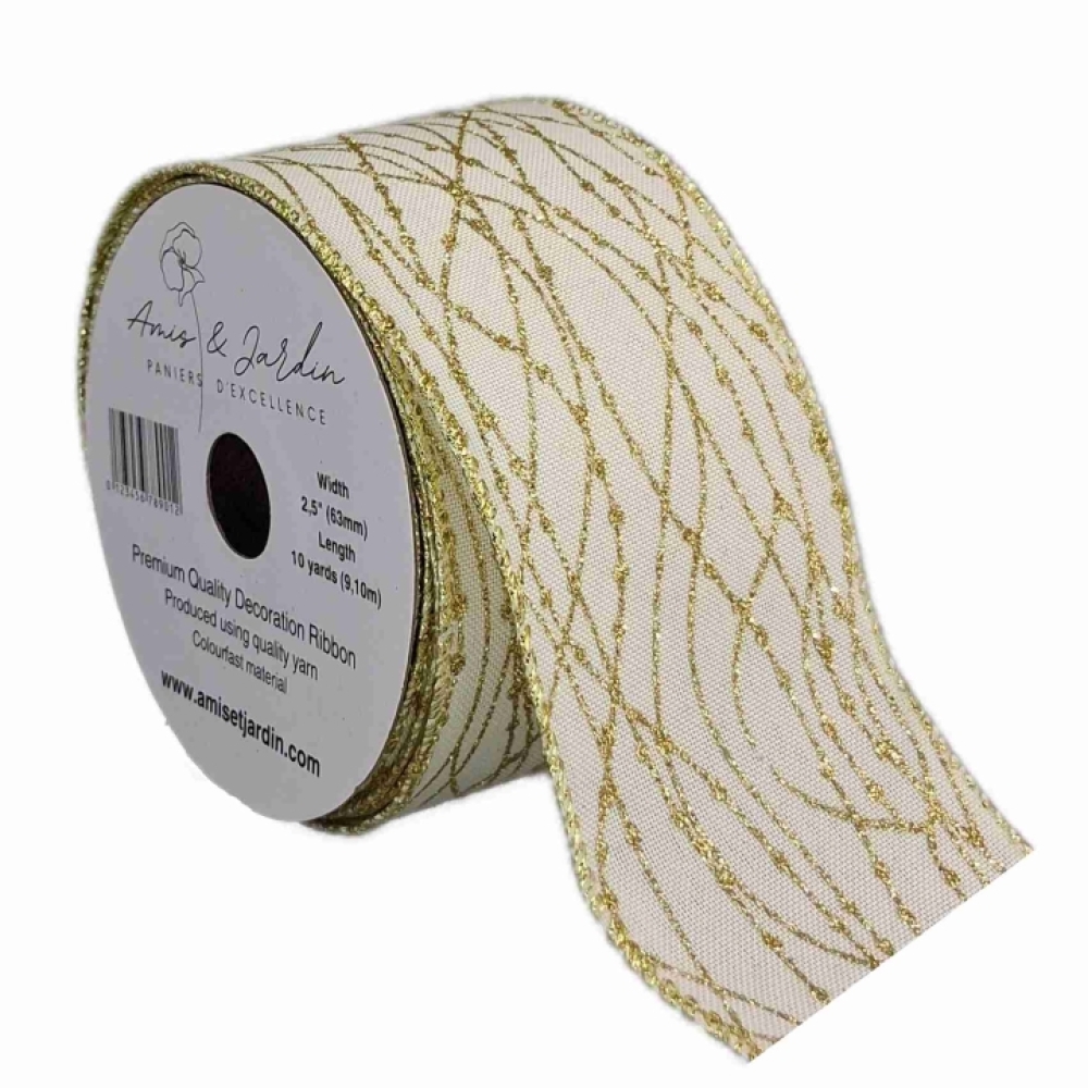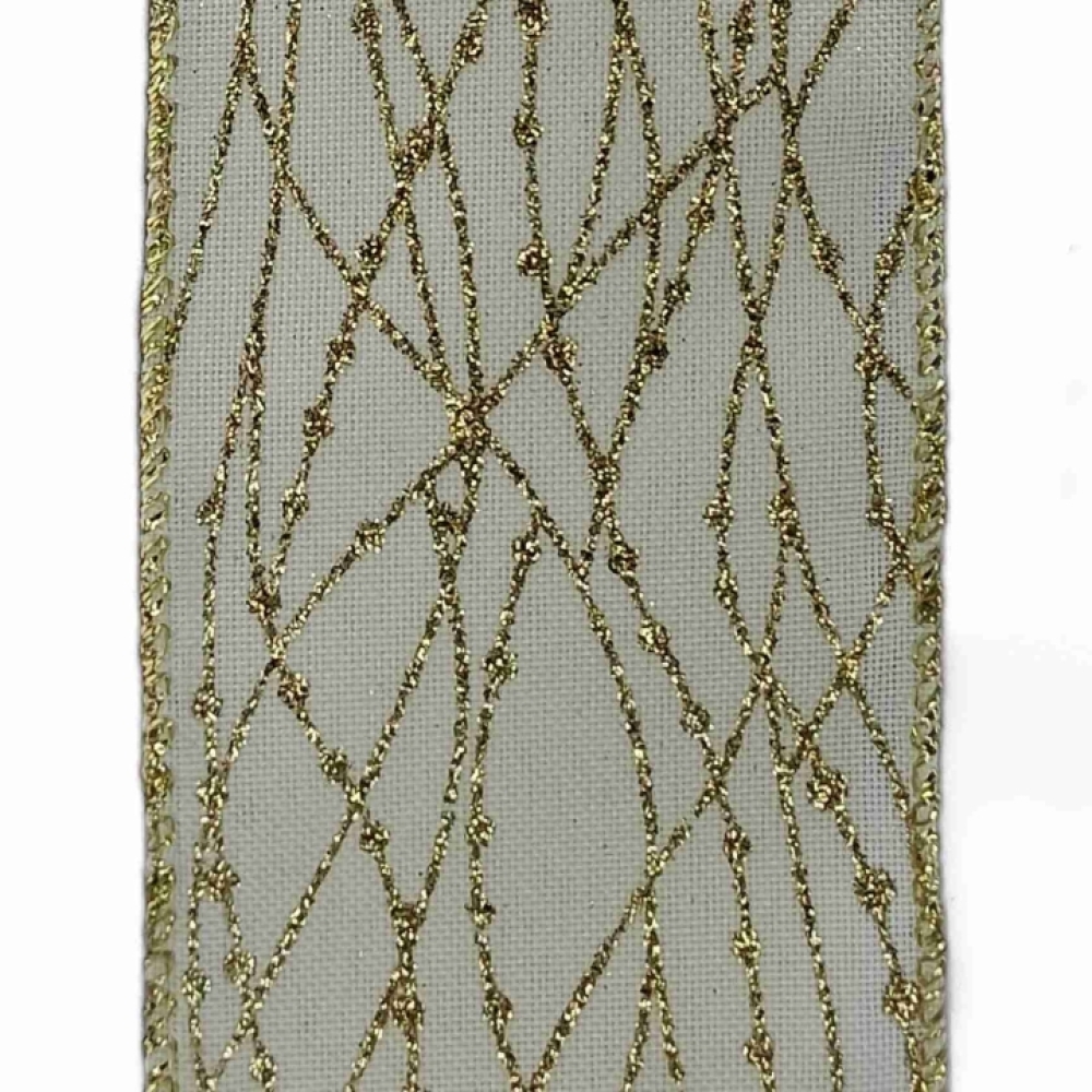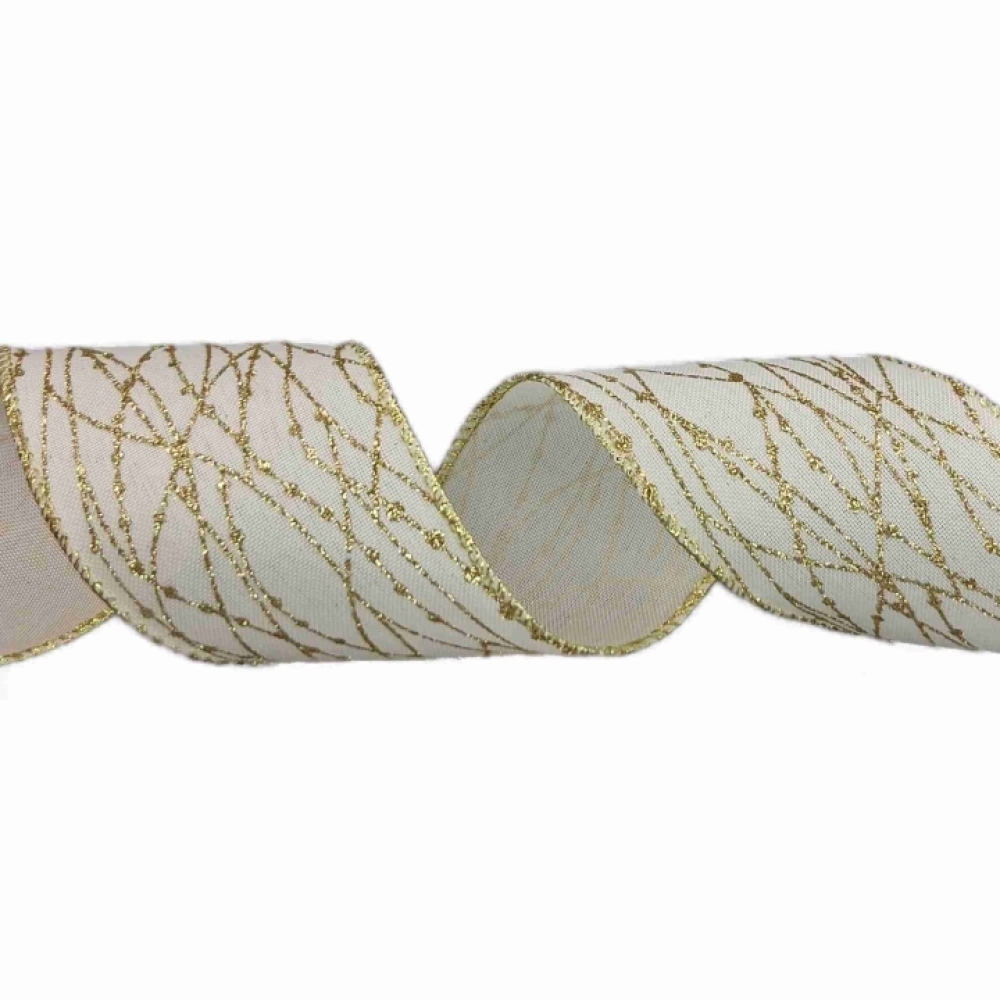 Elgantní bílá stuha se zlatými třpytivými propletenými linkami, působí luxusně, vhodná pro vánoční i slavnostní výzdobu.