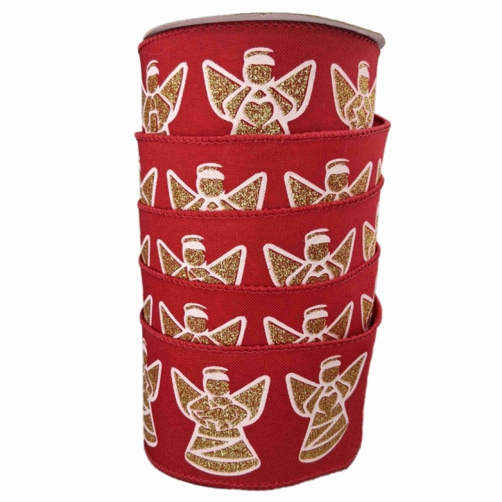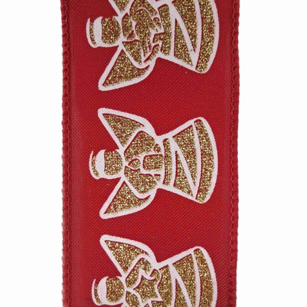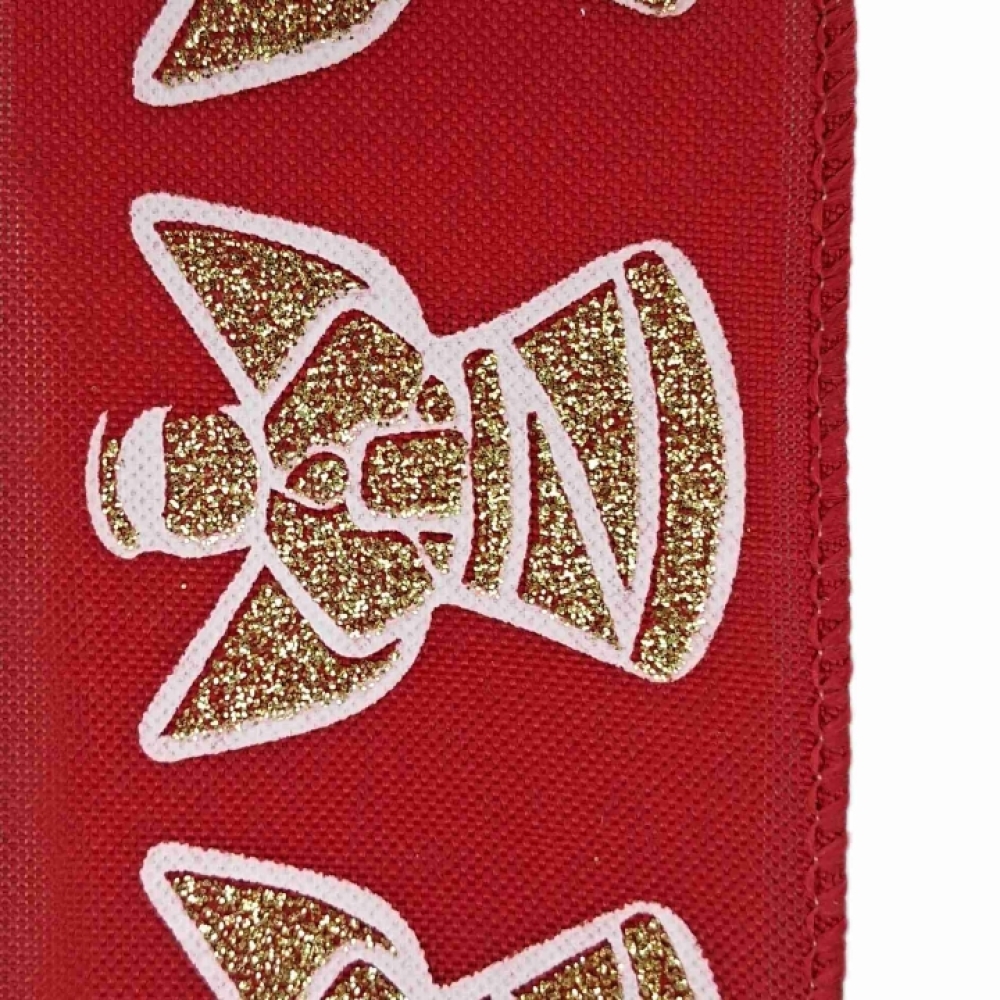Sytě červená stuha, bílá silueta andělů, výplně zlatými třpytkami, drátkovaný lem.