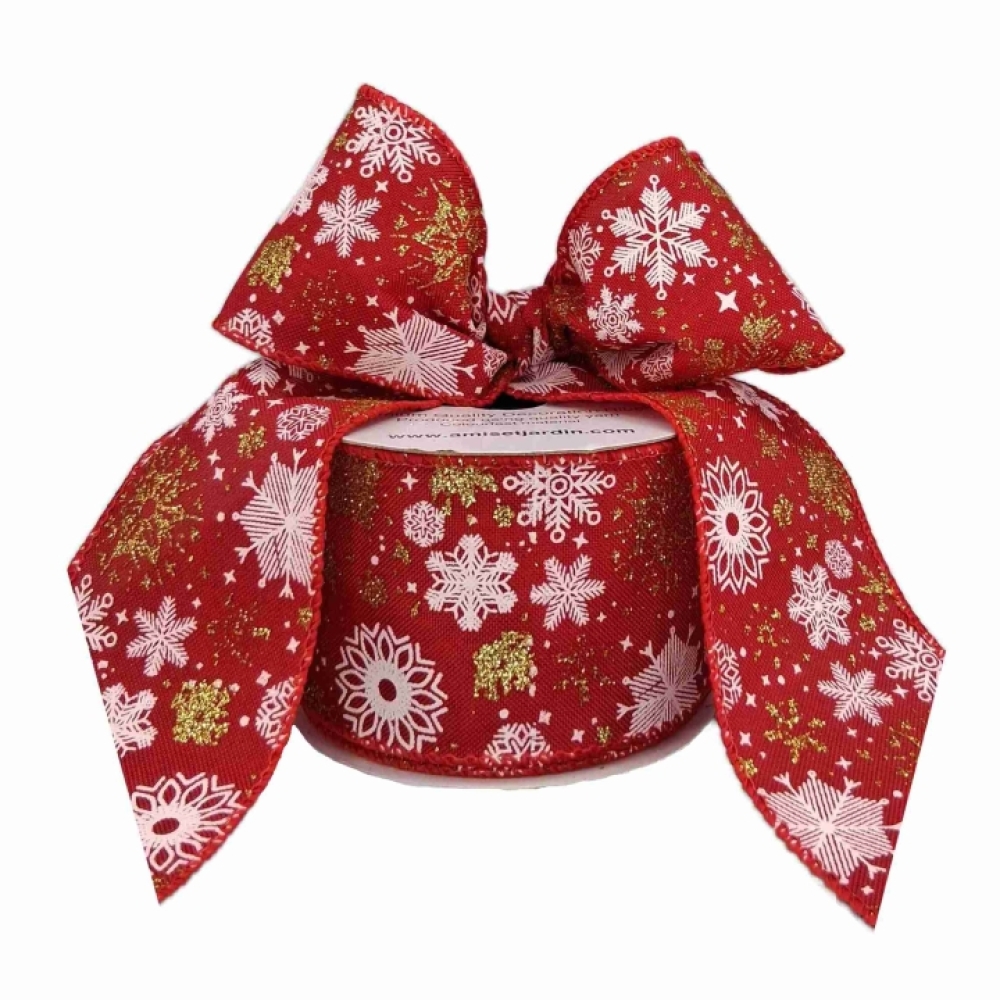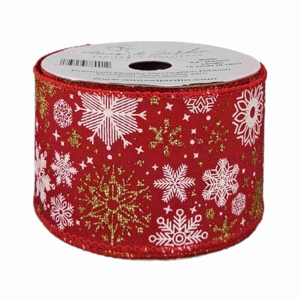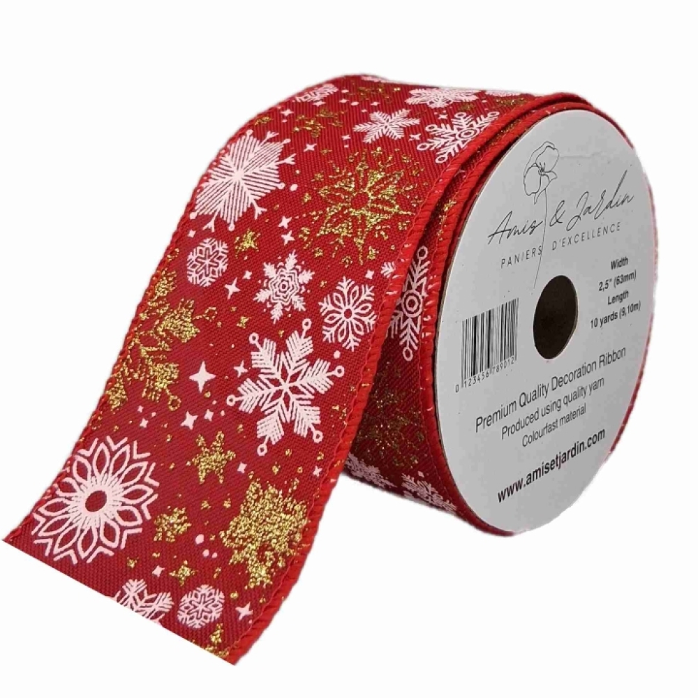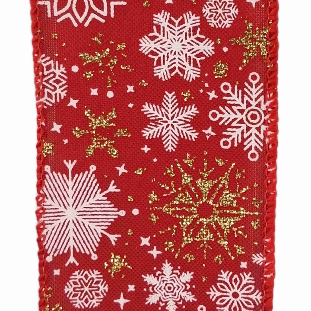 Výrazná červená vánoční stuha se zlatými a bílými vločkami a hvězdami, ideální pro sváteční dekorace a balení dárků.