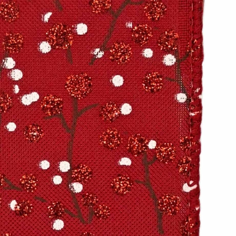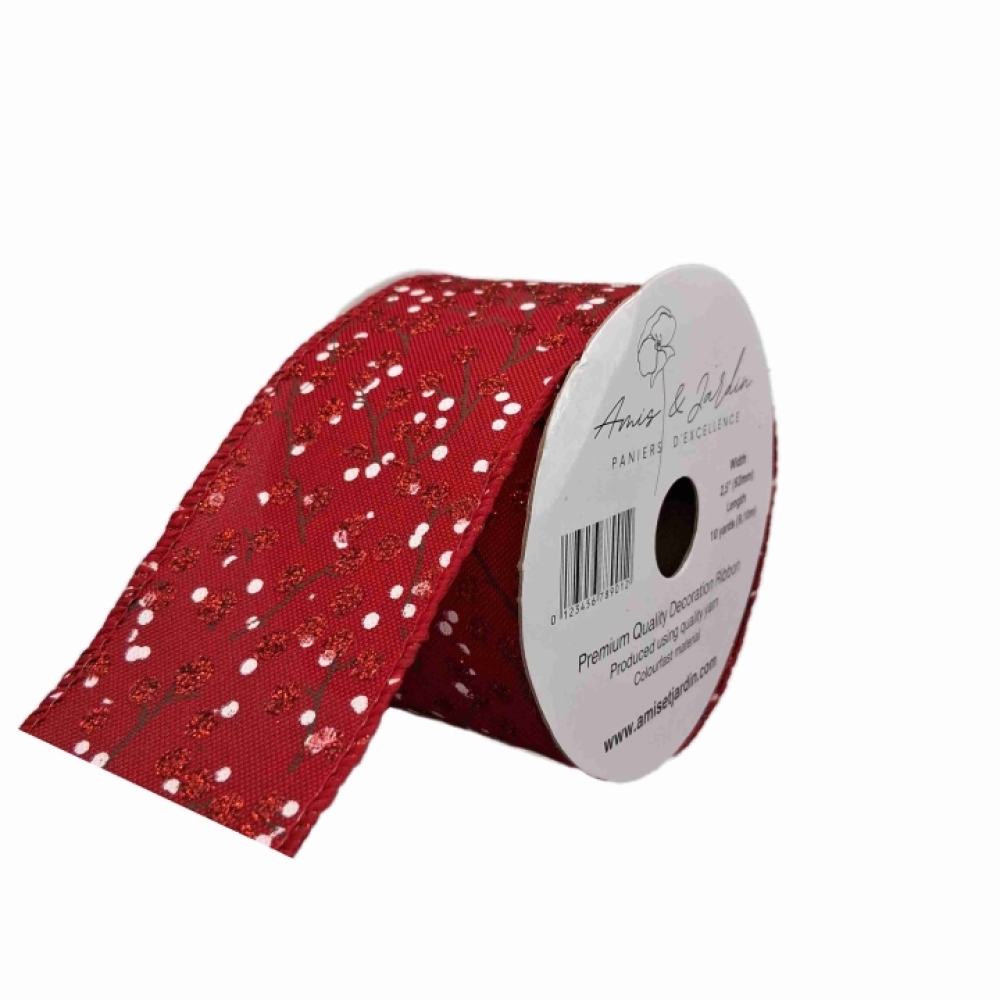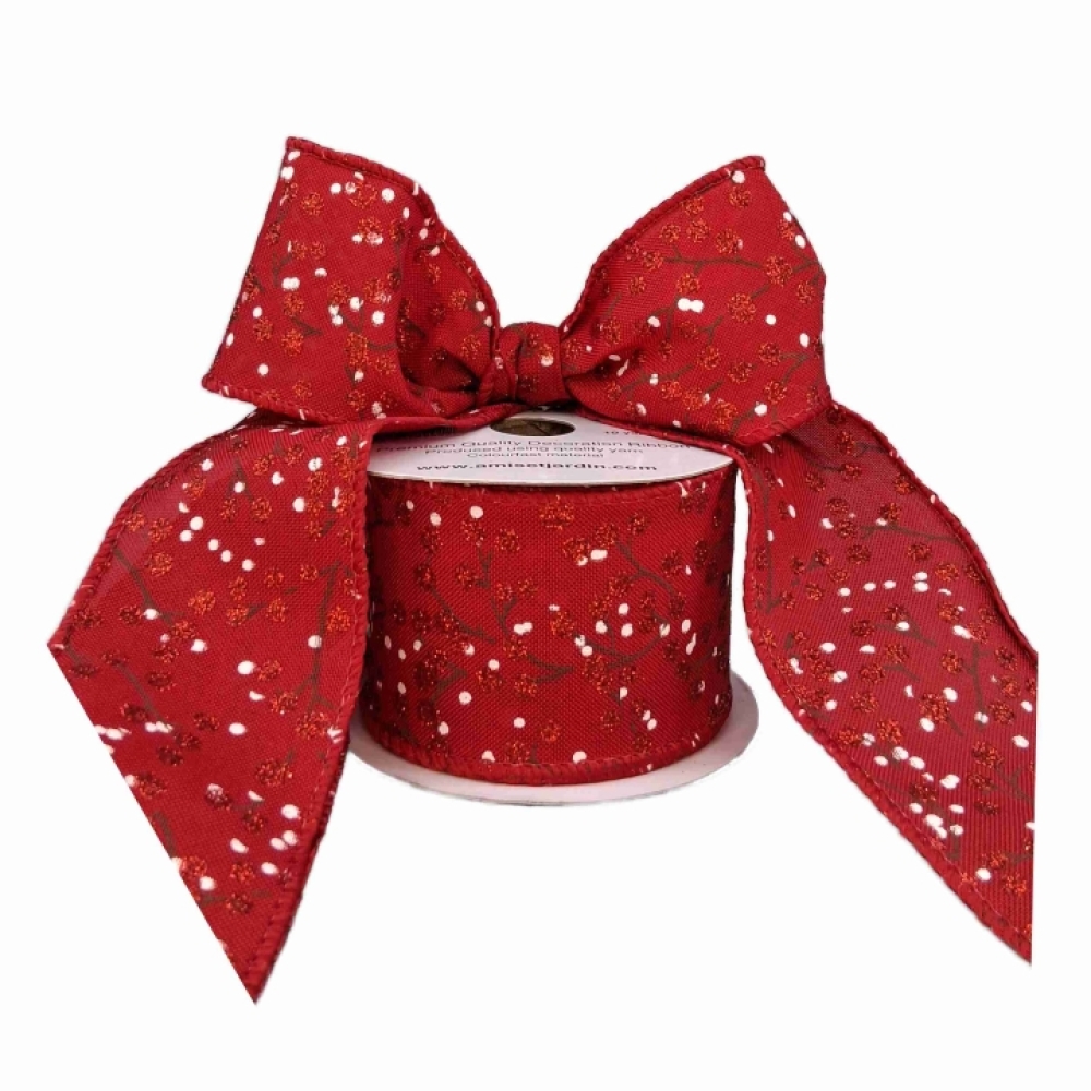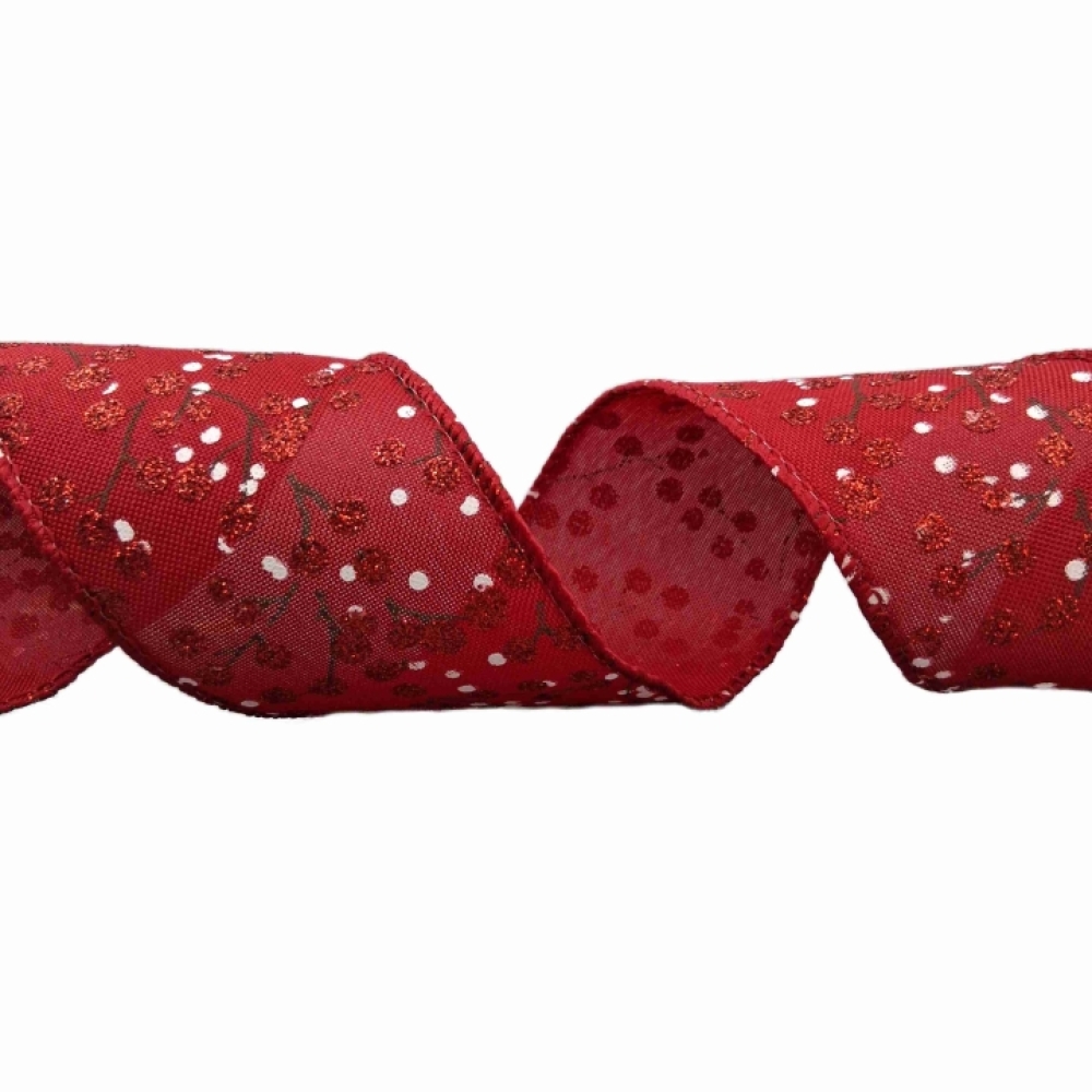 Červená stuha s červenými třpytivými bobulemi a bílými puntíky (sněhový efekt).