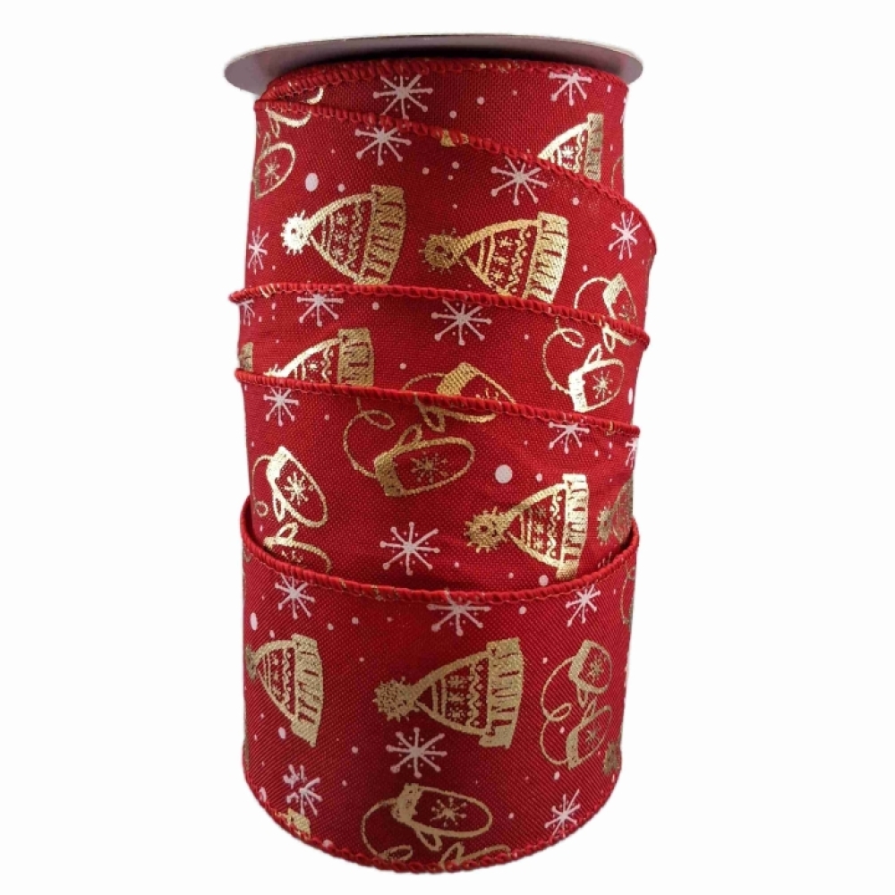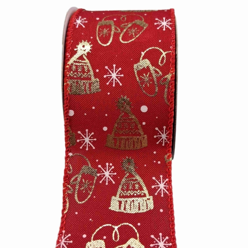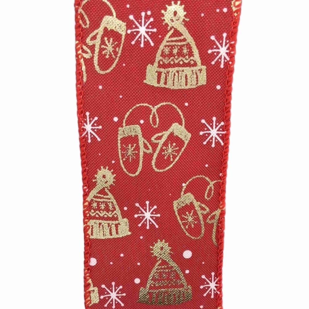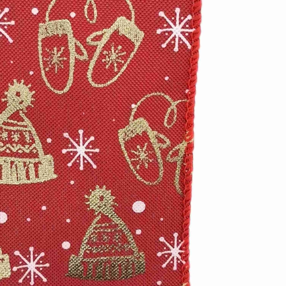 Červená stuha se zlatým lesklým zimním motivem, vhodná pro vánoční dekorace.
