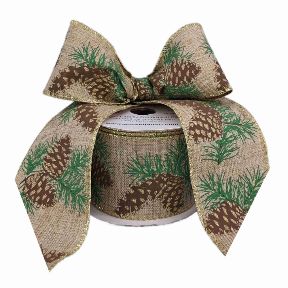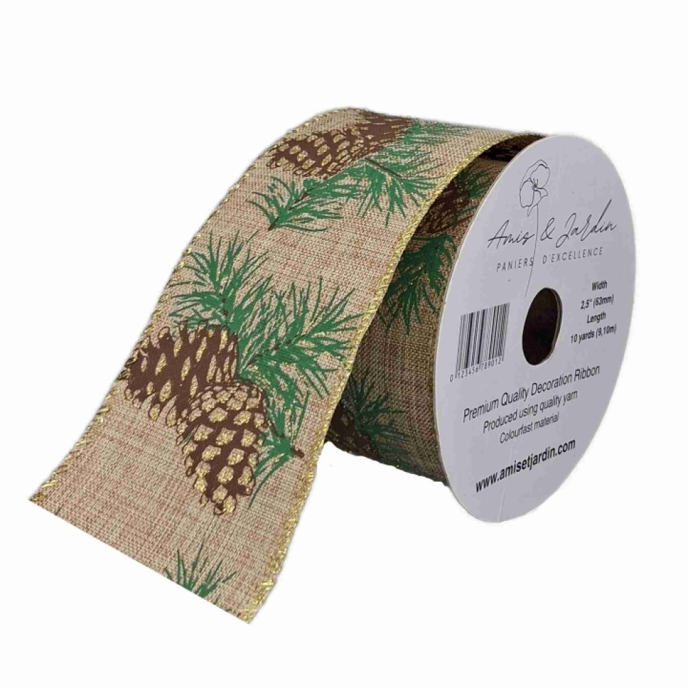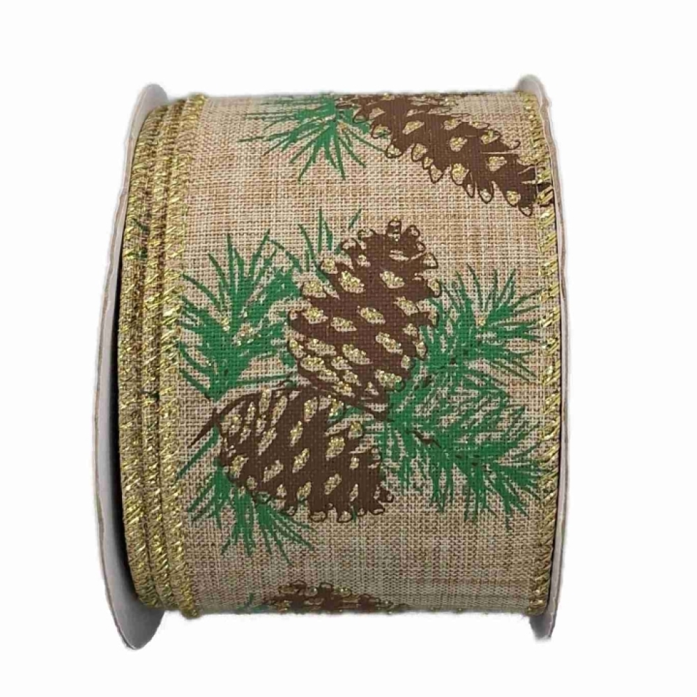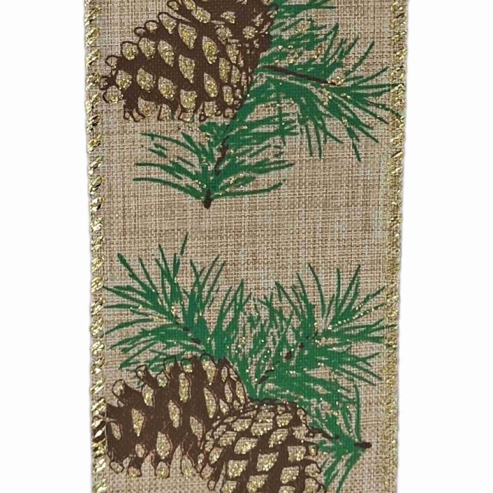 Hnědá přírodní stuha s motivem šišek a jehličí se zlatými třpytkami, ideální pro vánoční dekorace a přírodní aranžmá.