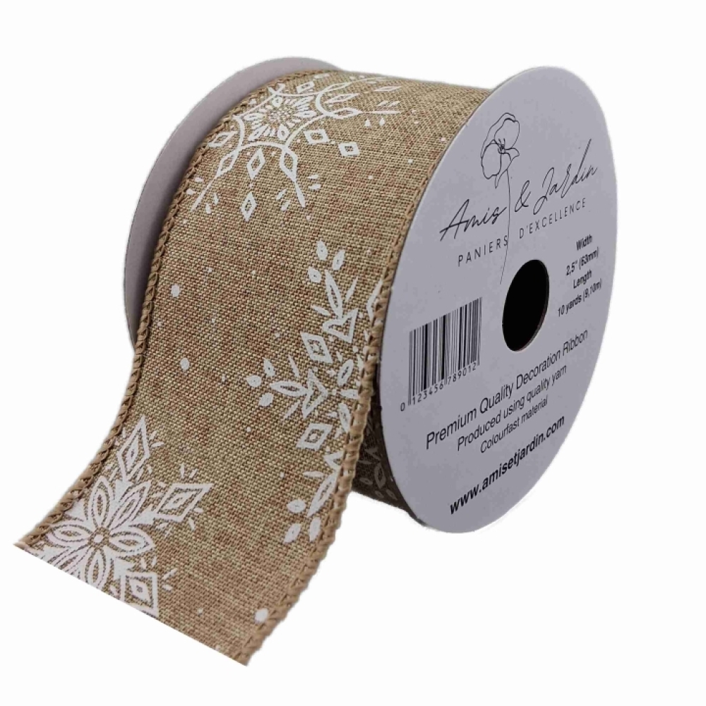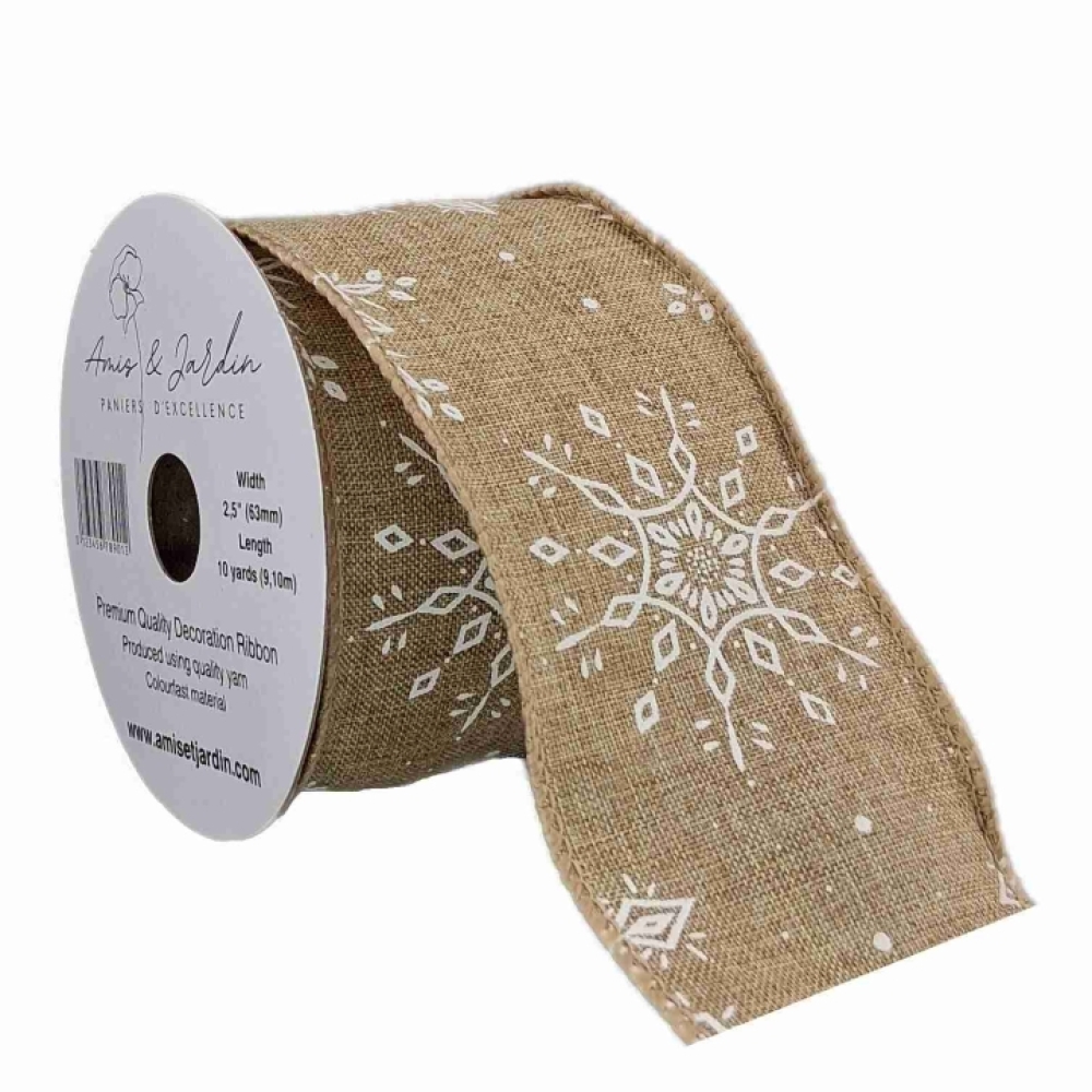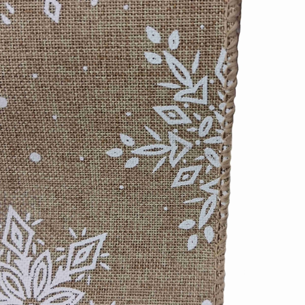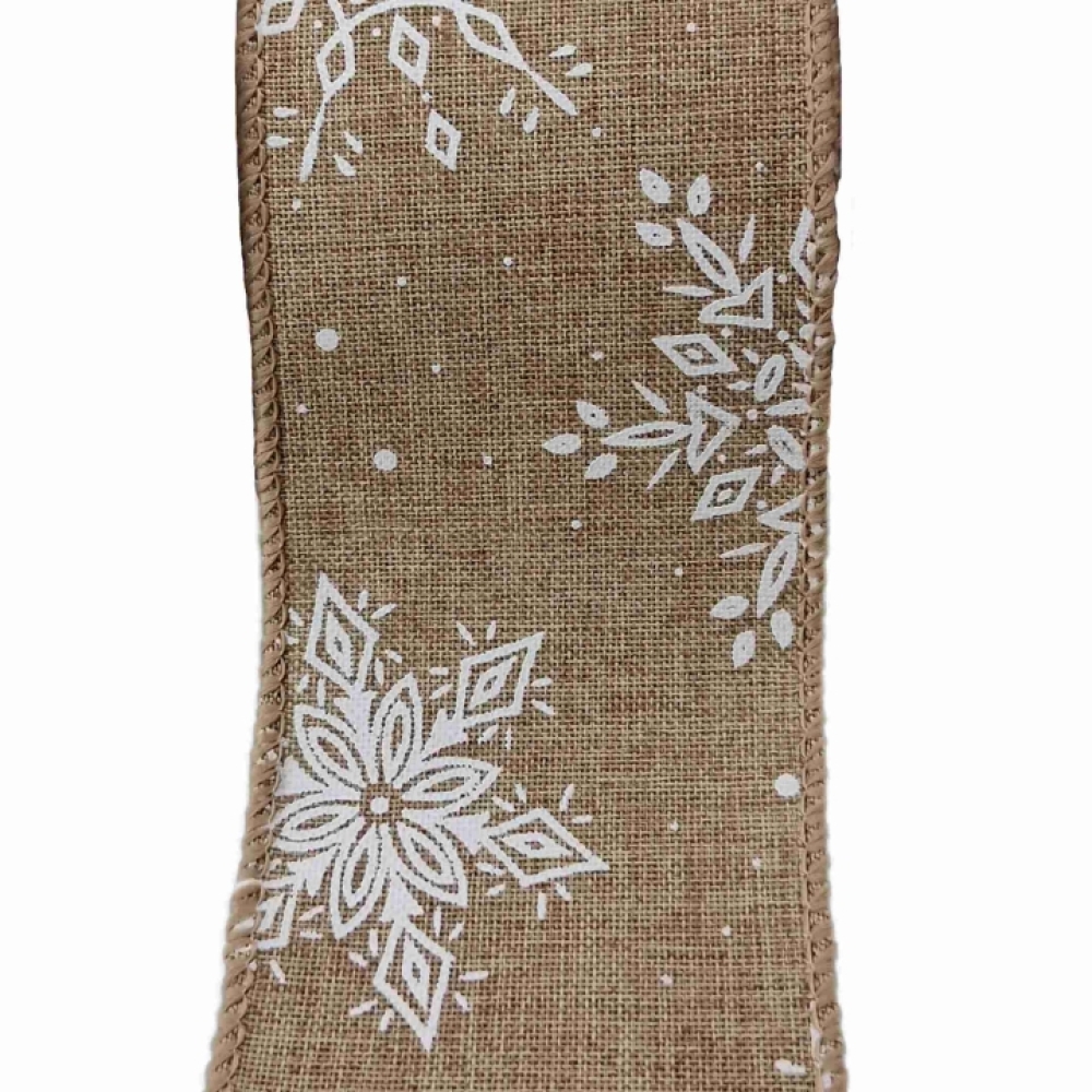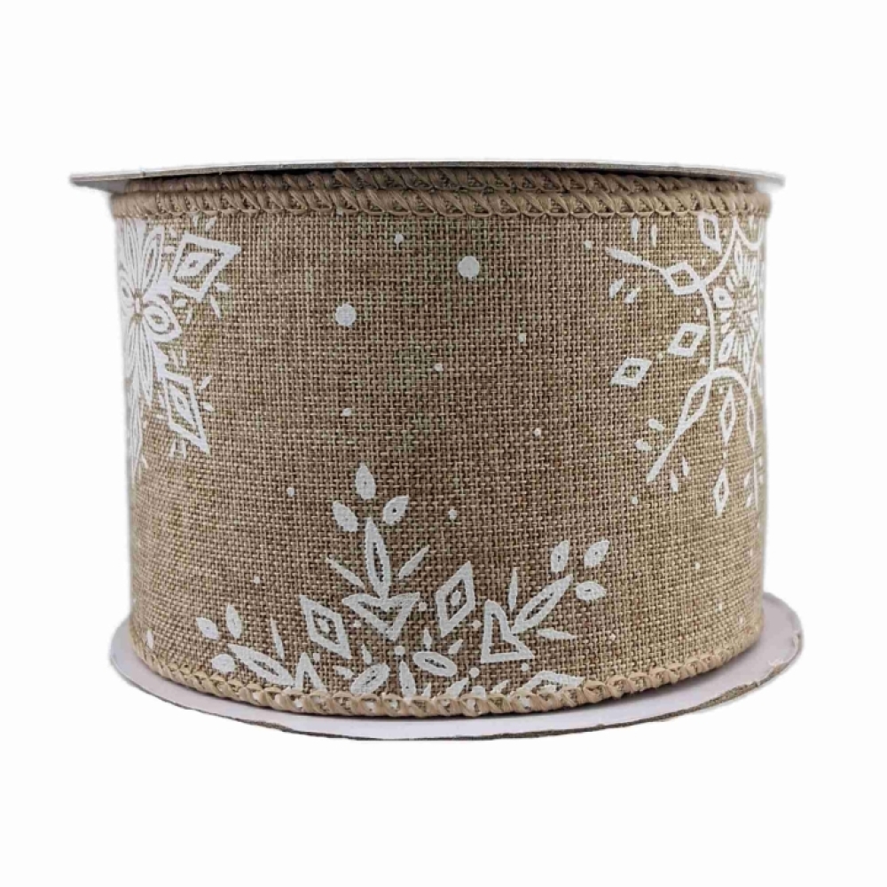 Přírodní jutová stuha s bílými vločkami, rustikální vzhled vhodný pro vánoční dekorace nebo dárkové balení.