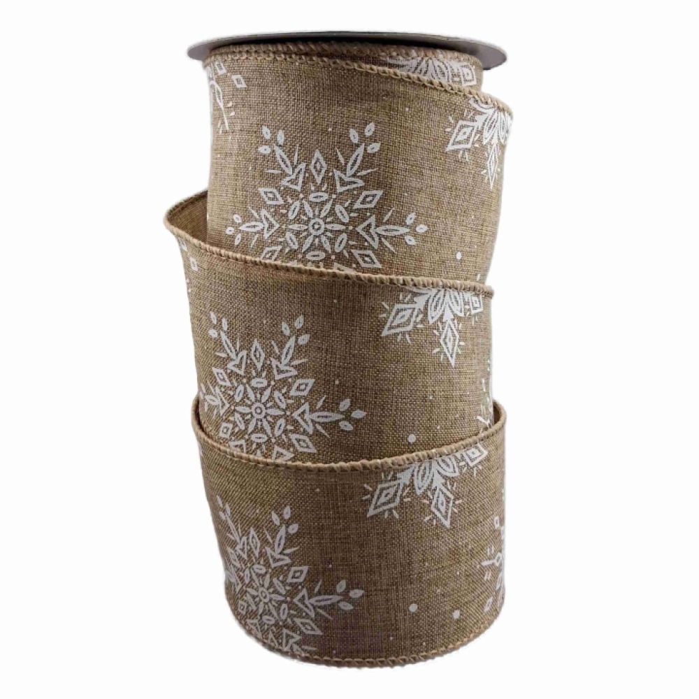 Stuha jutová s drátkem hnědá zimní sněhové vločky 9.1 m