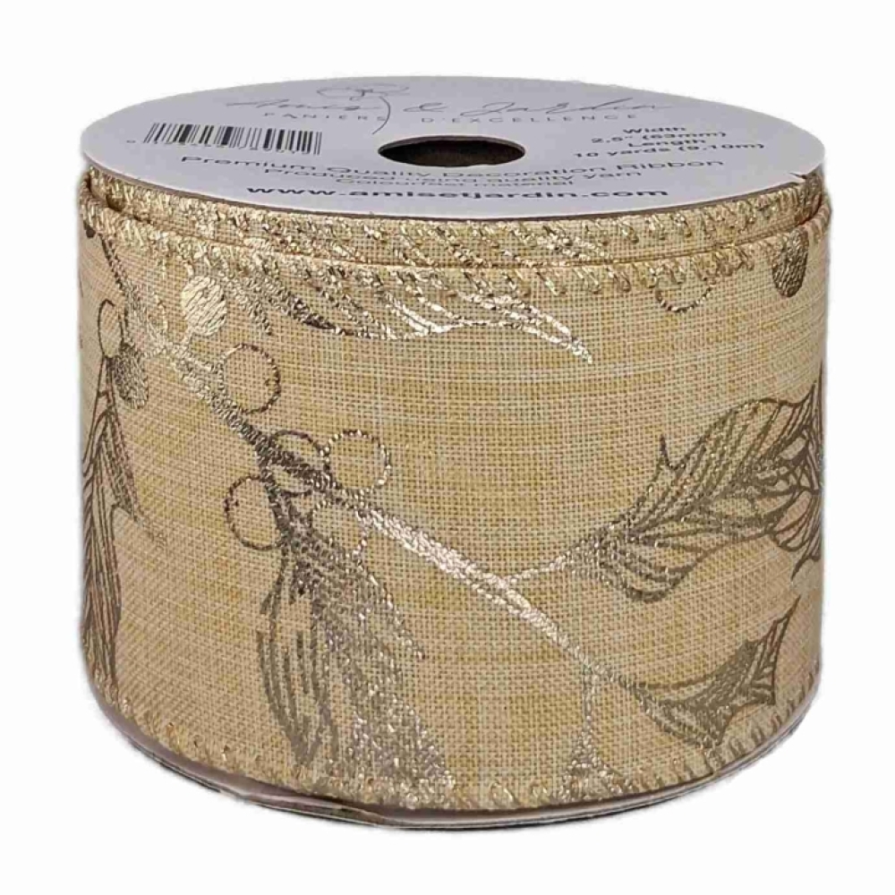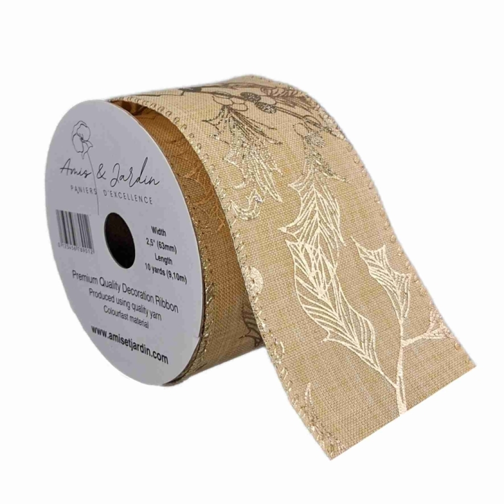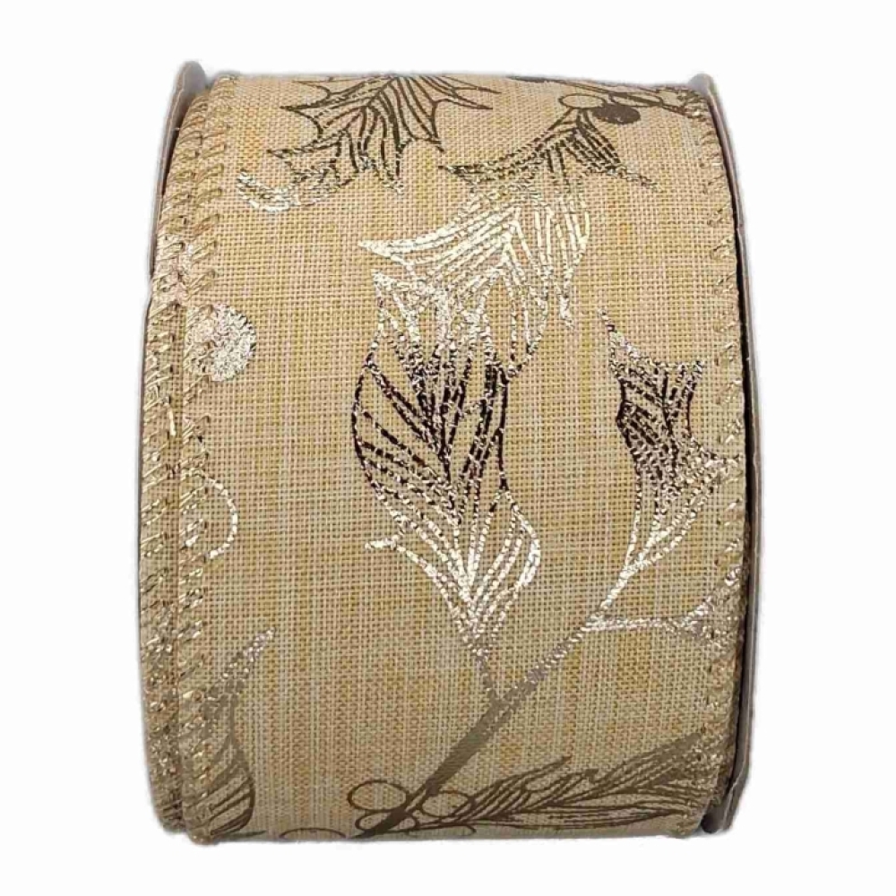Decentní béžová stuha se zlatým metalickým potiskem větviček, působí elegantně a vánočně.