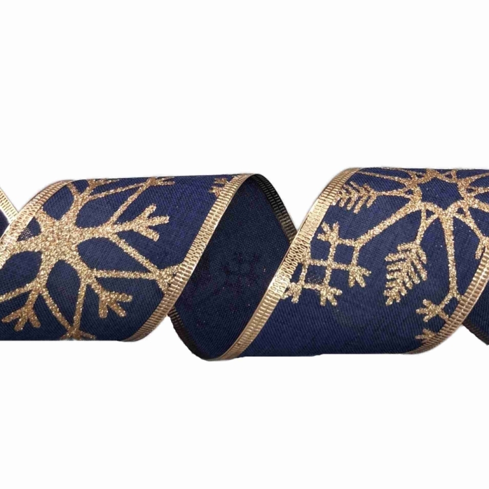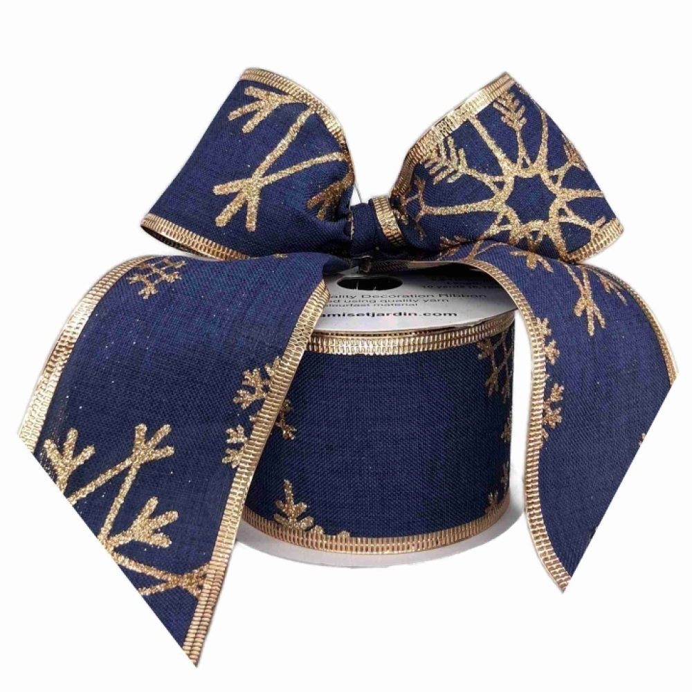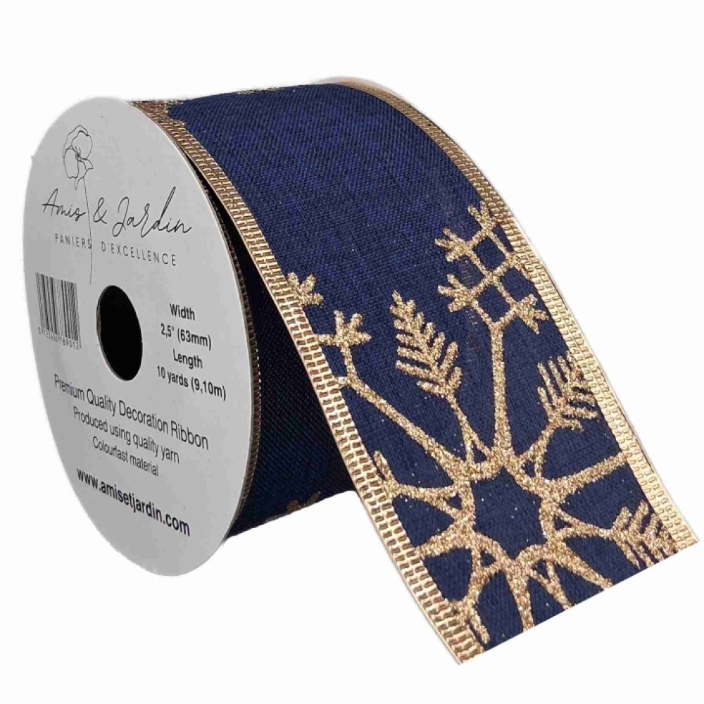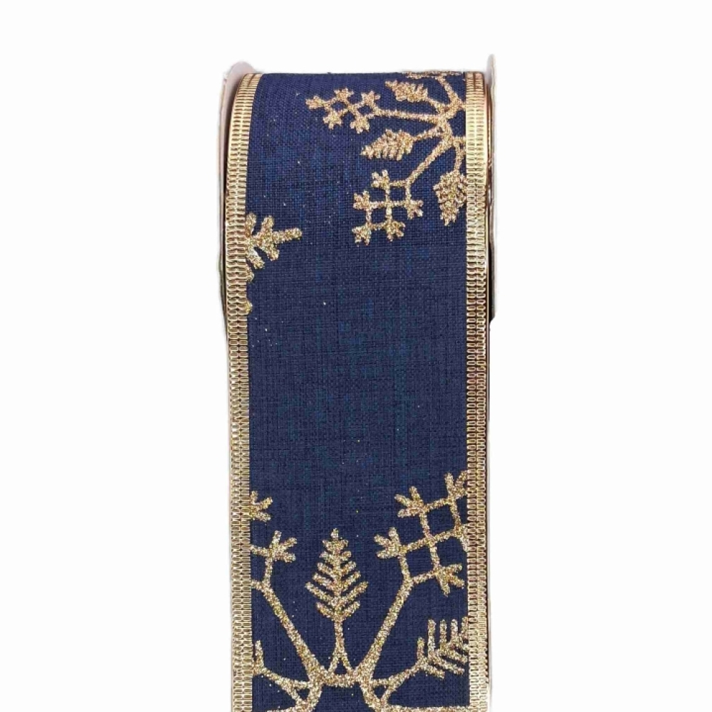 Silný zlatý okraj, elegantní tmavě modrá stuha se zlatým třpytivým vzorem větvičky, luxusní vzhled vhodný na vánoční dekorace.