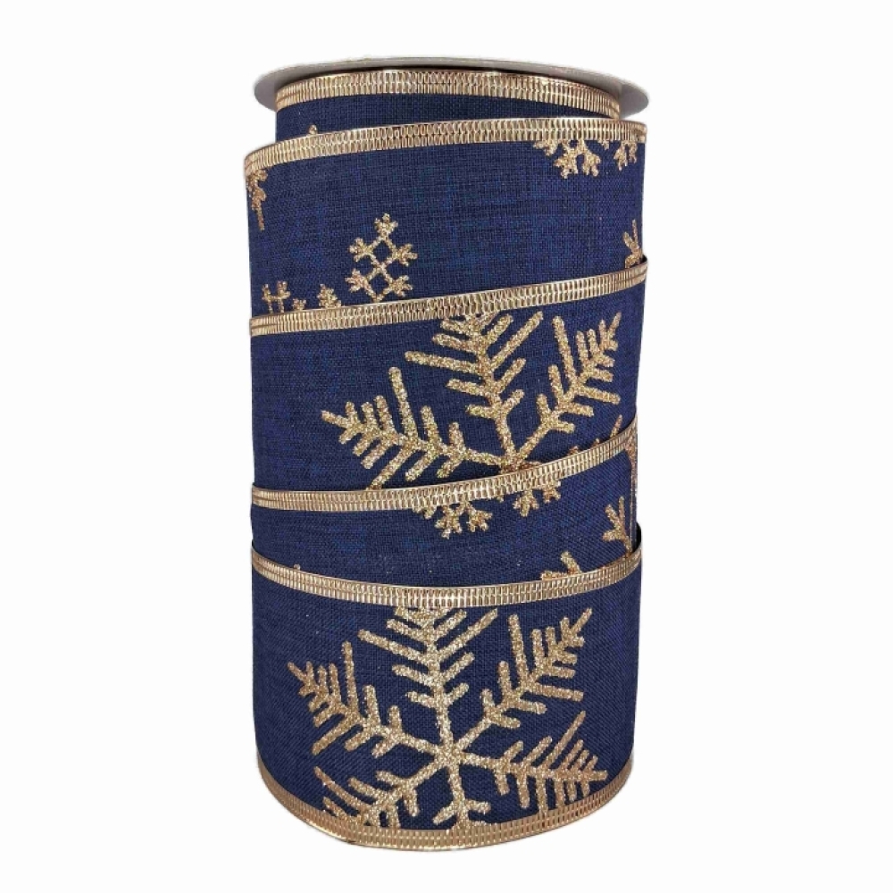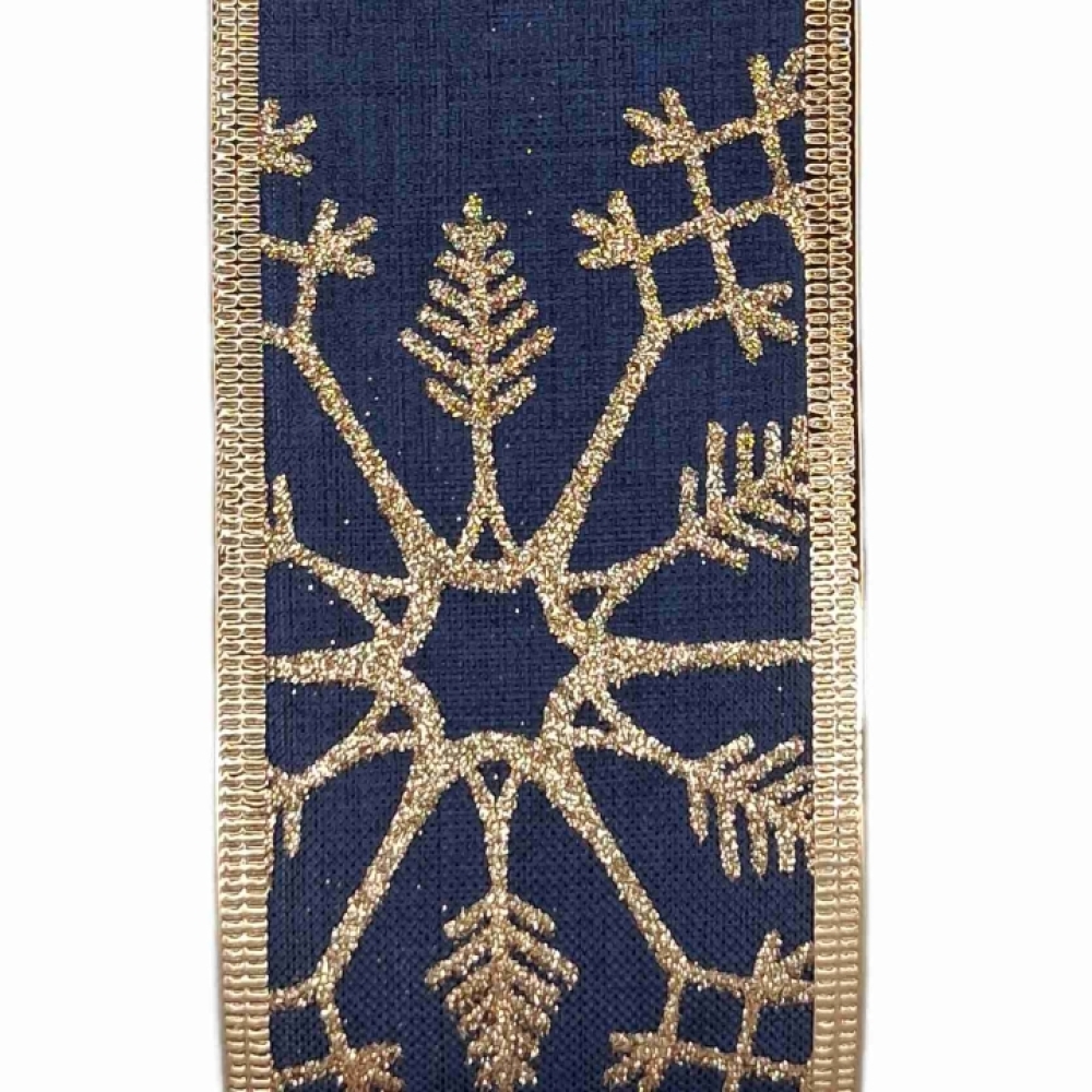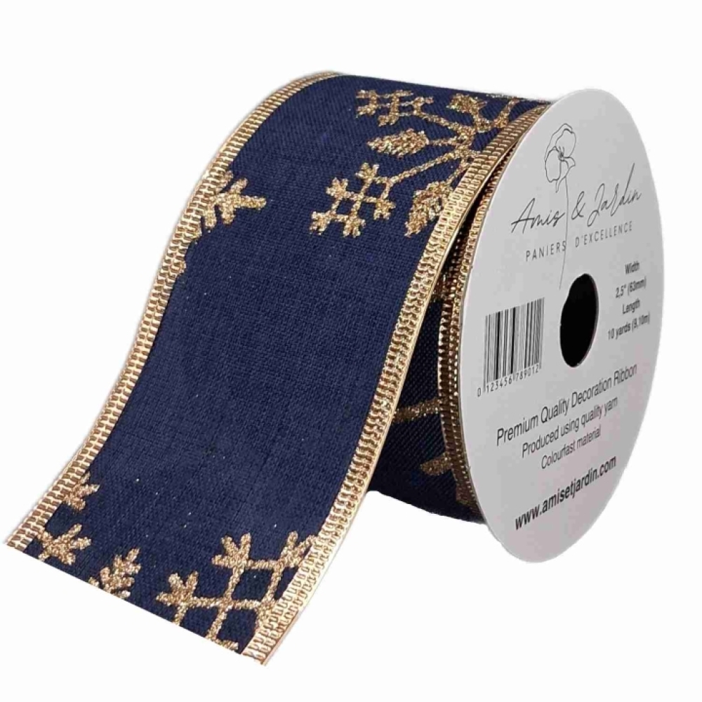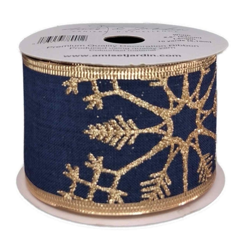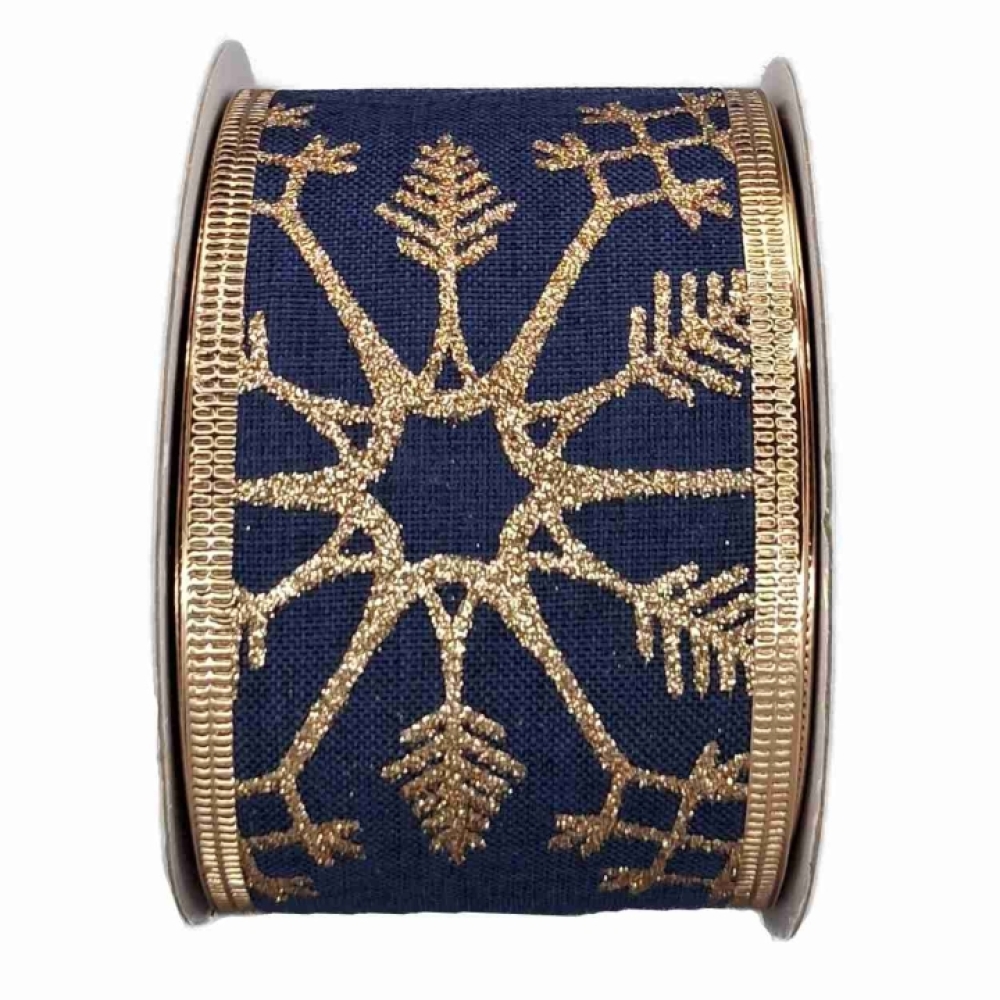 Silný zlatý okraj, elegantní tmavě modrá stuha se zlatým třpytivým vzorem větvičky, luxusní vzhled vhodný na vánoční dekorace.