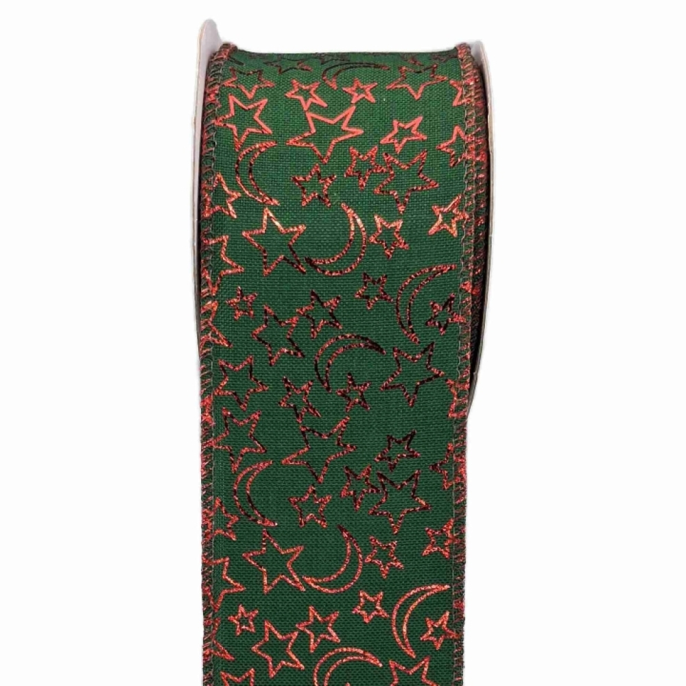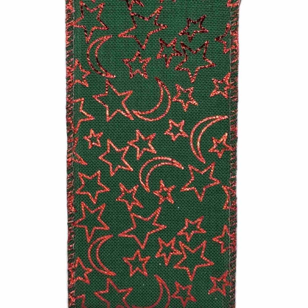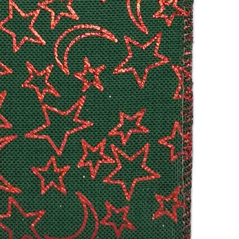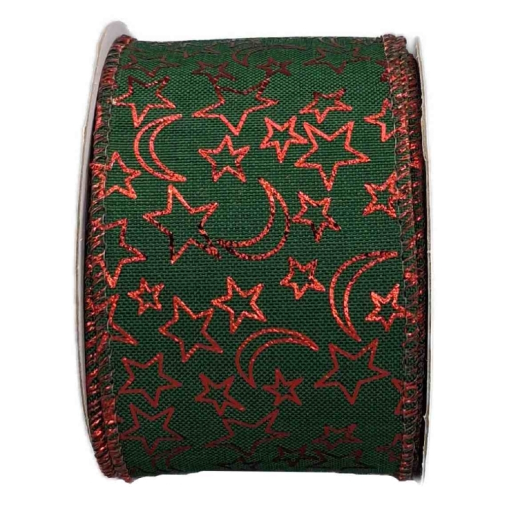 Tmavě zelená vánoční stuha se vzorem hvězd a měsíců, ideální pro červenozelené dekorace.