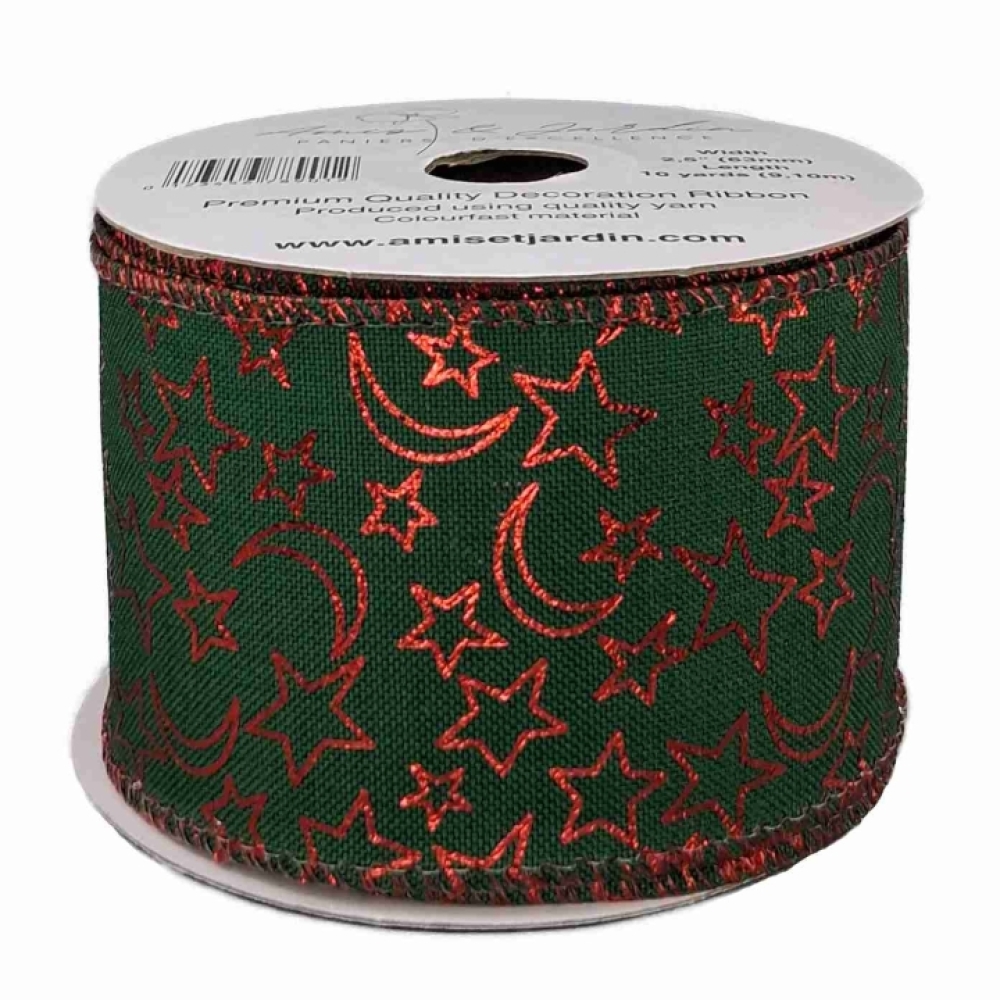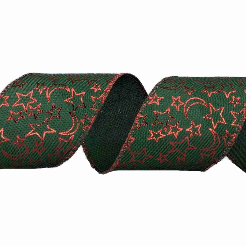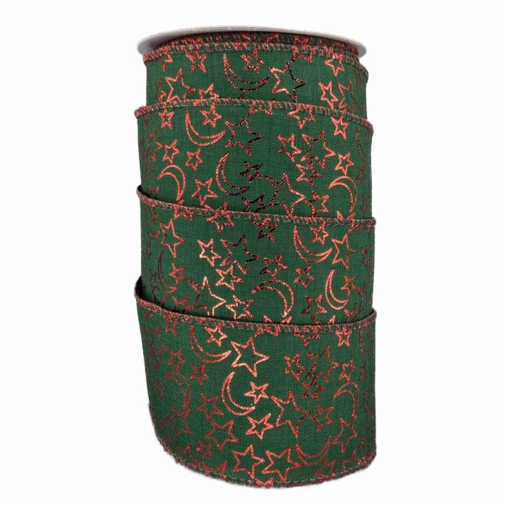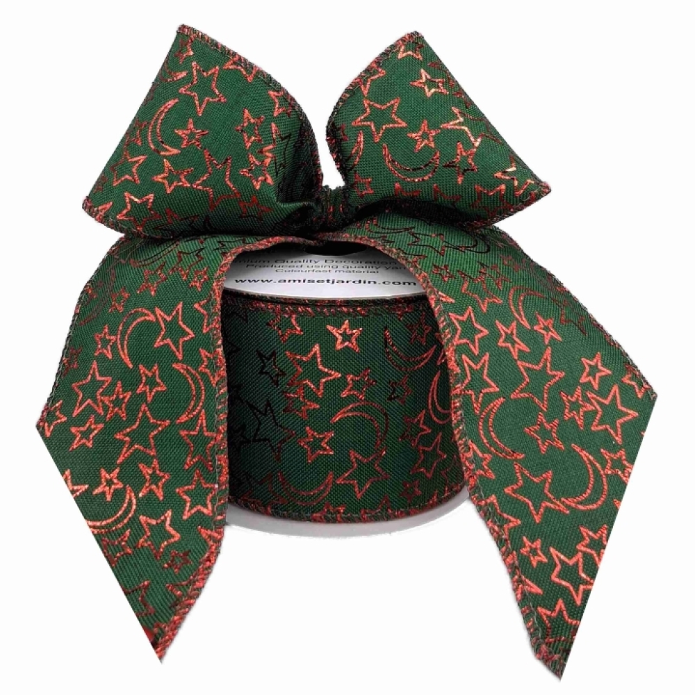 Tmavě zelená vánoční stuha se vzorem hvězd a měsíců, ideální pro červenozelené dekorace.