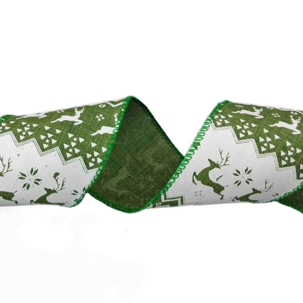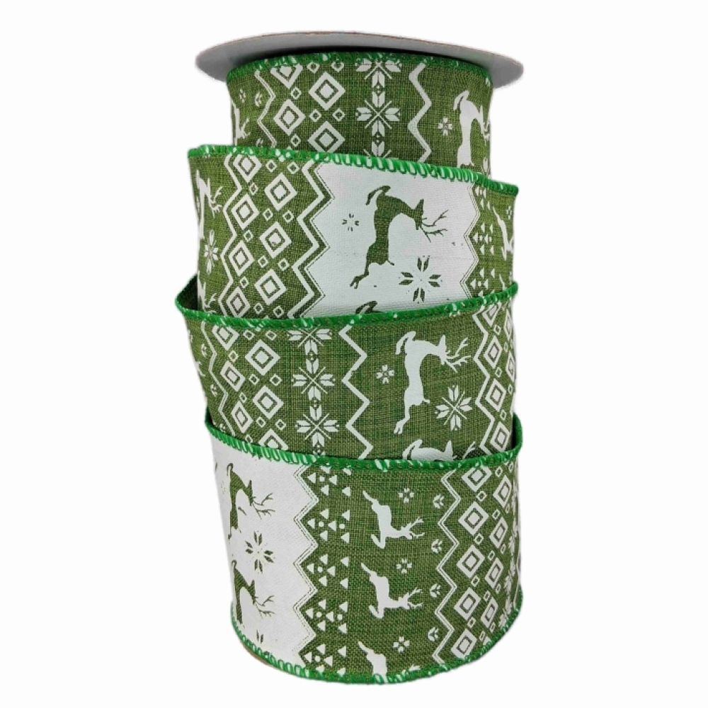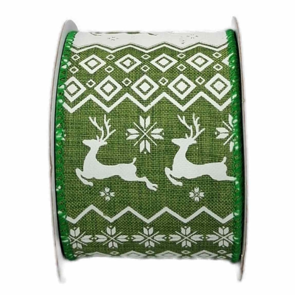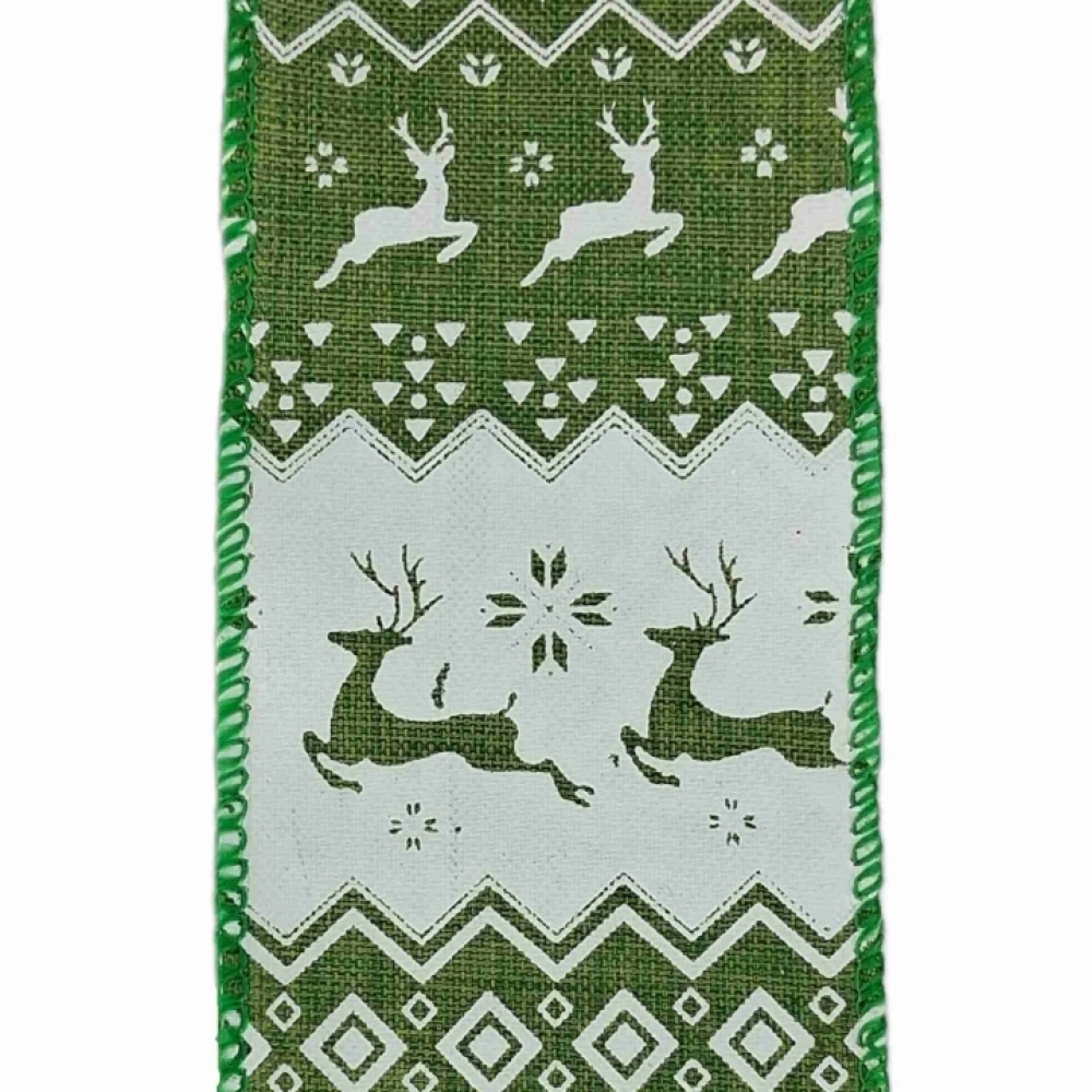 Zelená vánoční stuha s bílými jeleny a severským vzorem, vánoční vzor, drátkovaný lem.