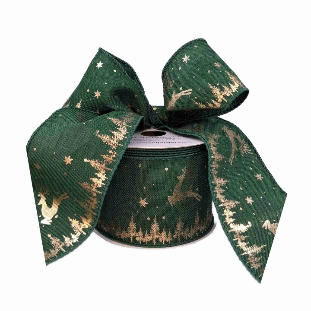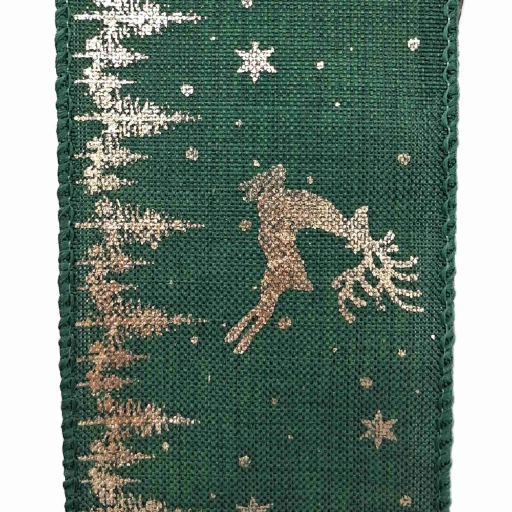 Sytě zelená stuha, zlatý metalický jelen a hvězdy, stromečky, drátkovaný lem.