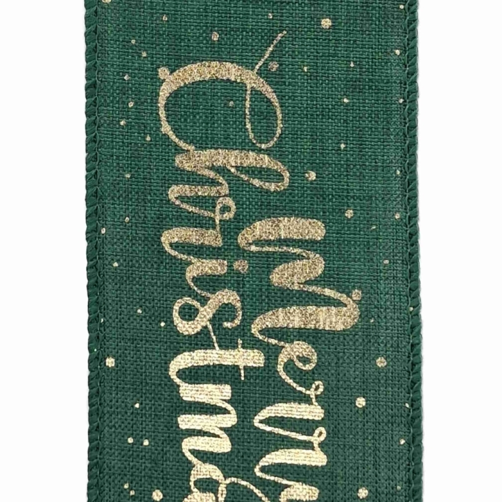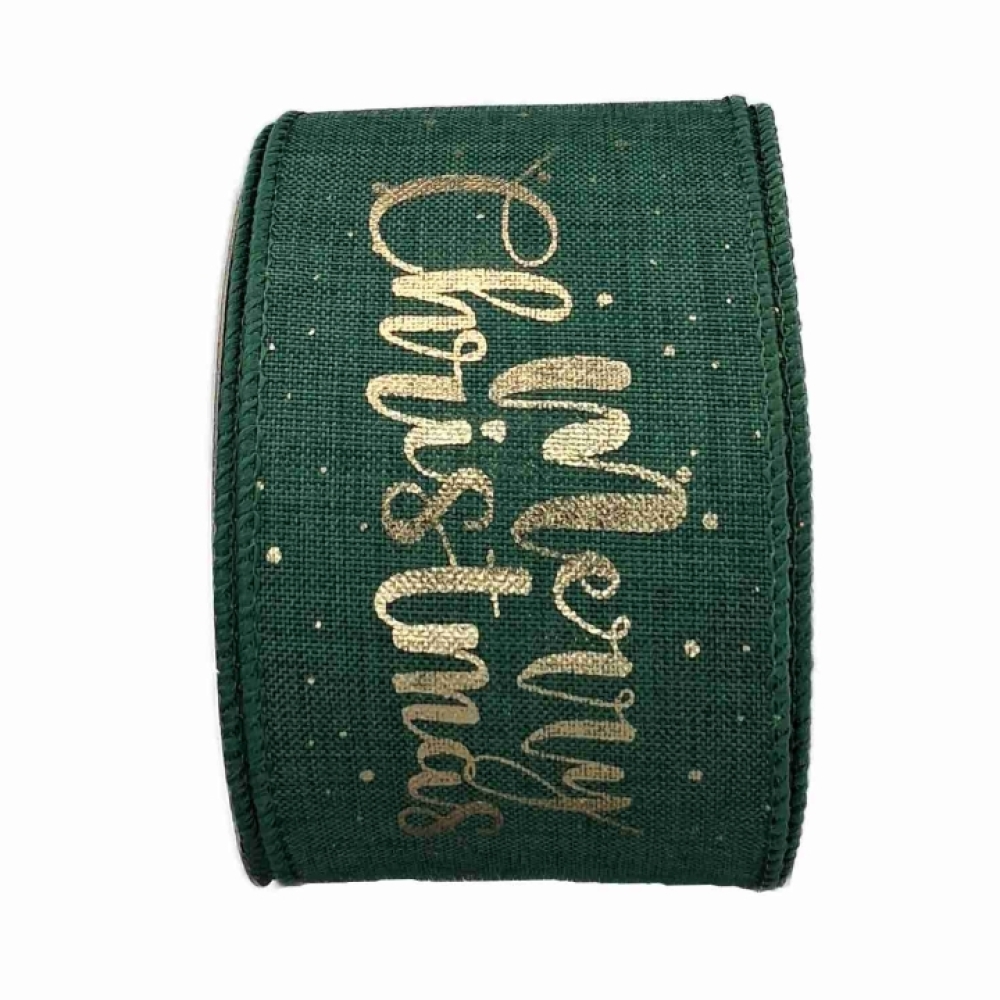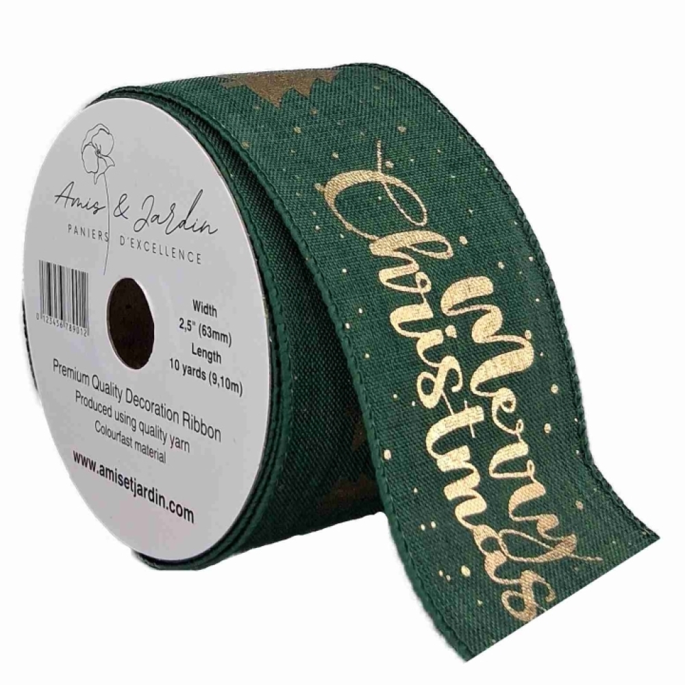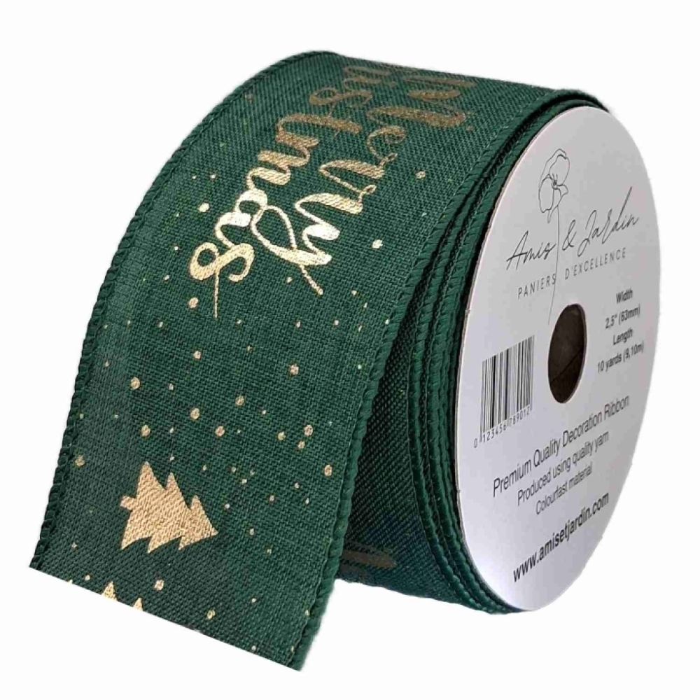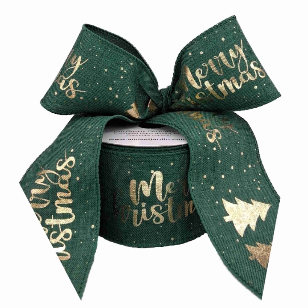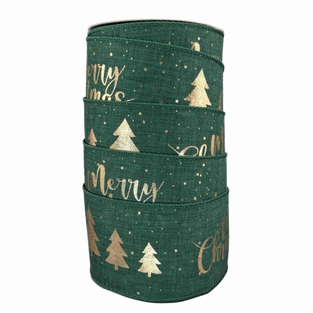 Zelená elegantní vánoční stuha s nápisem Merry Christman a stromečky, vhodná na dárky a sváteční dekorace.