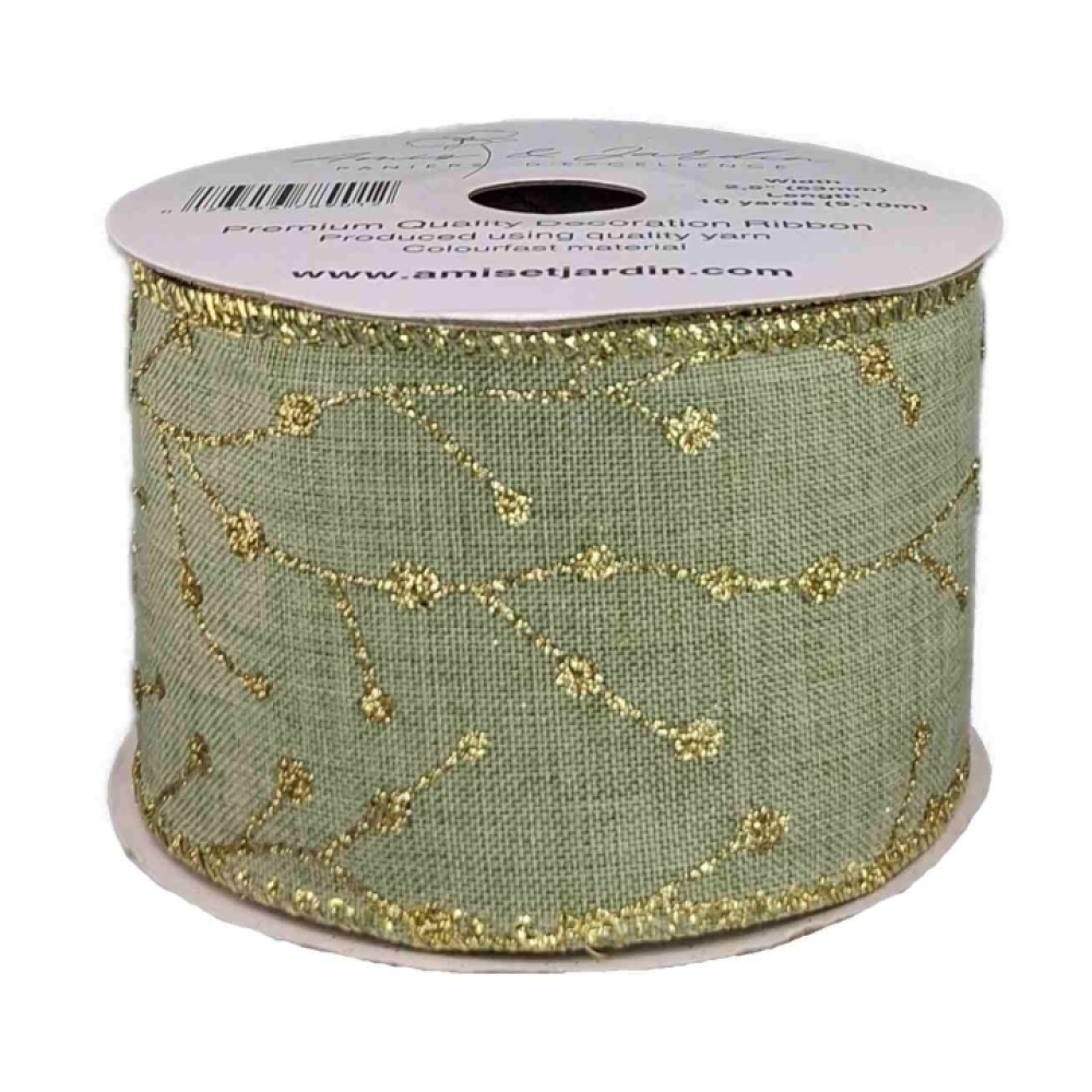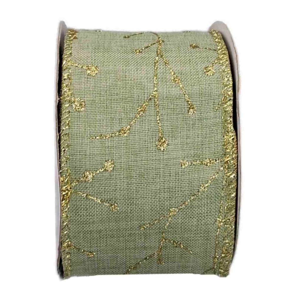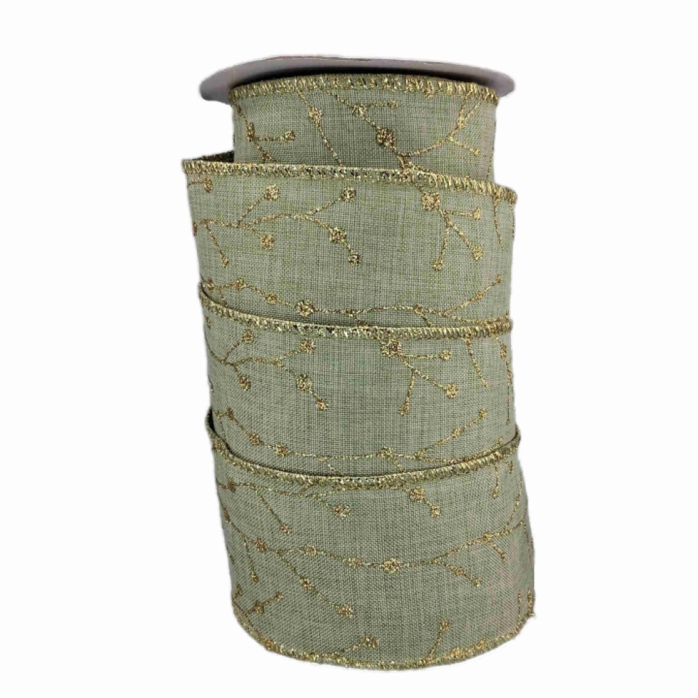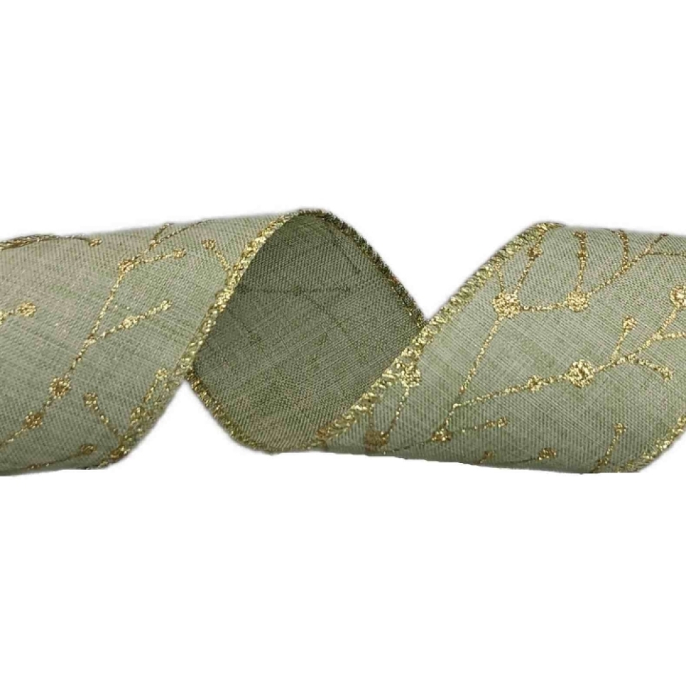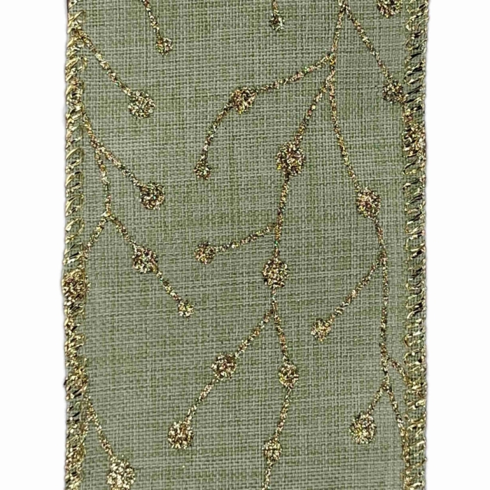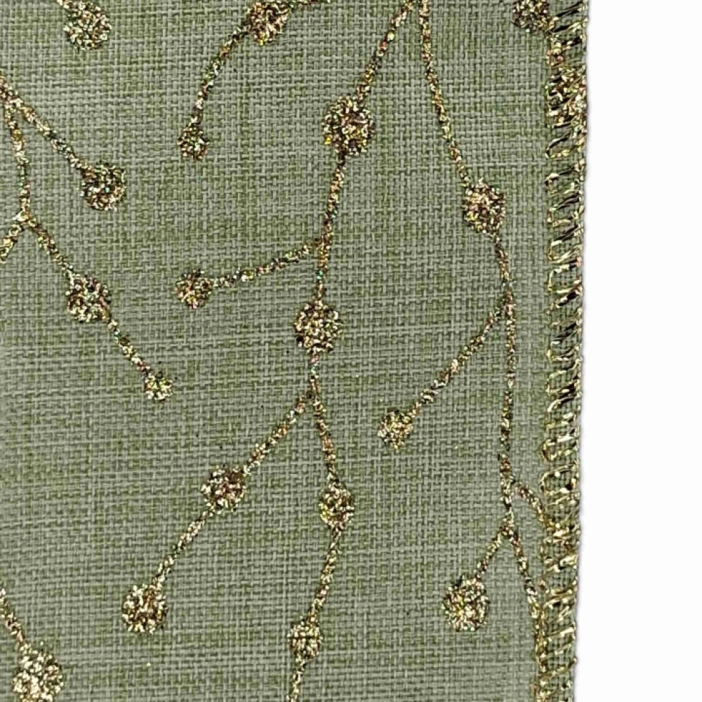 Decentní olivově zelená stuha se zlatým třpytivým motivem větviček, ideální pro vánoční dekorace, v přírodním stylu.