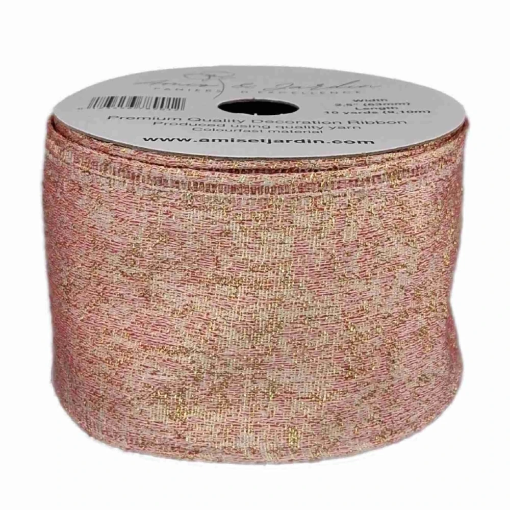 Stuha lněná s drátkem růžová zlaté třpytky 9.1 m