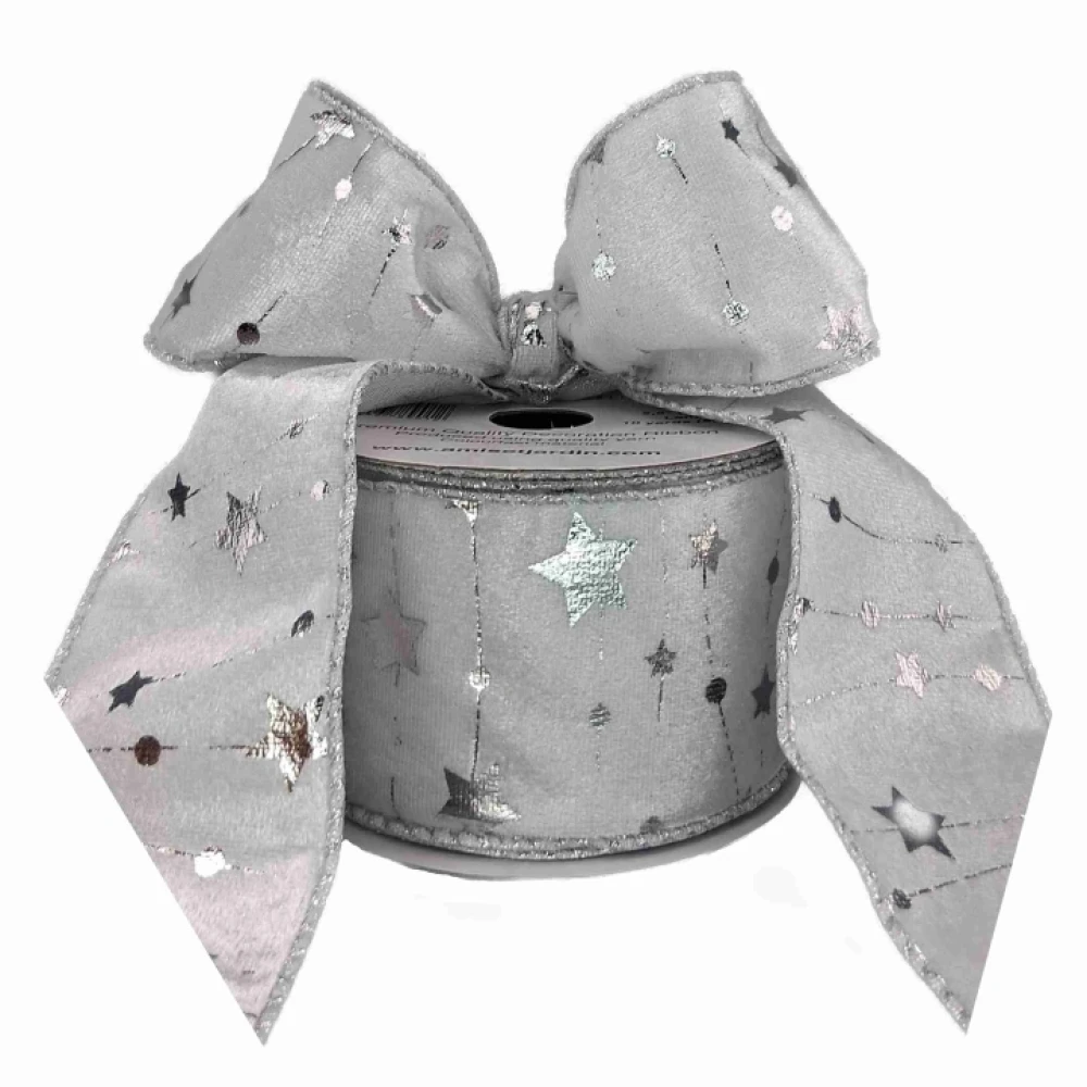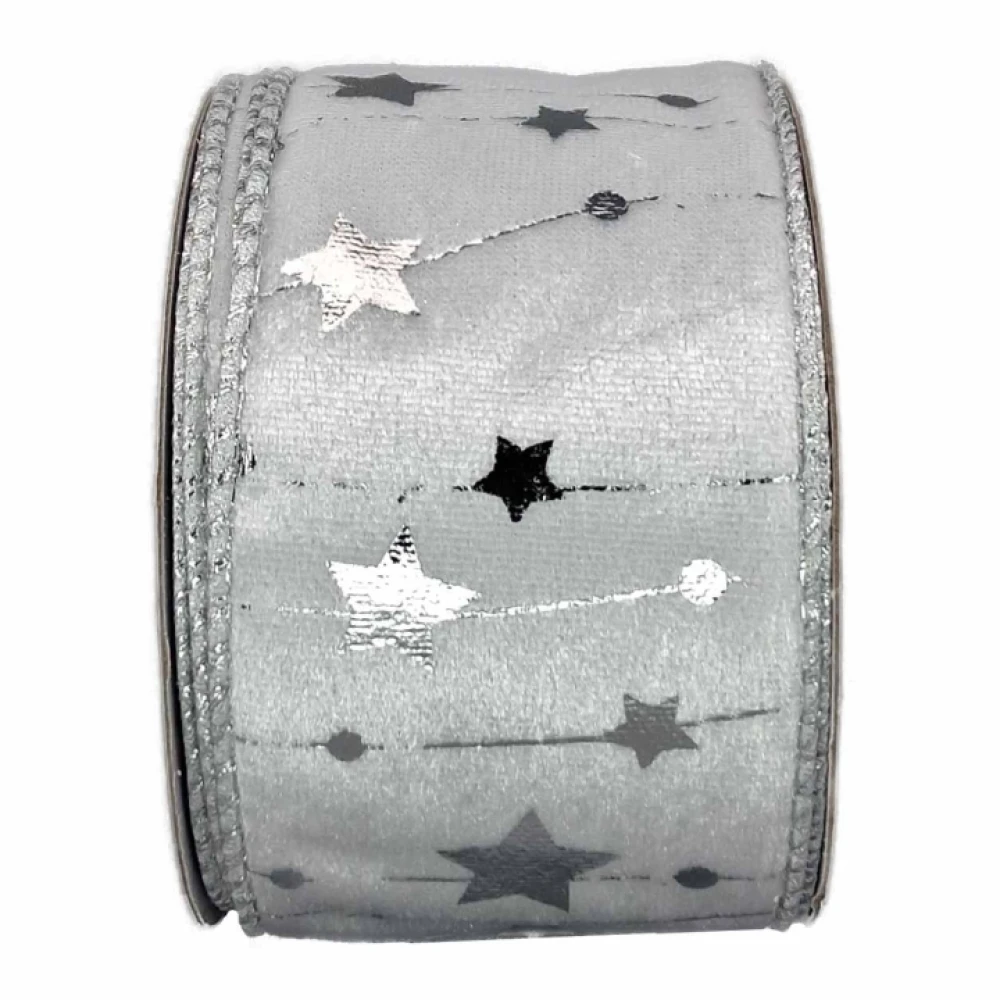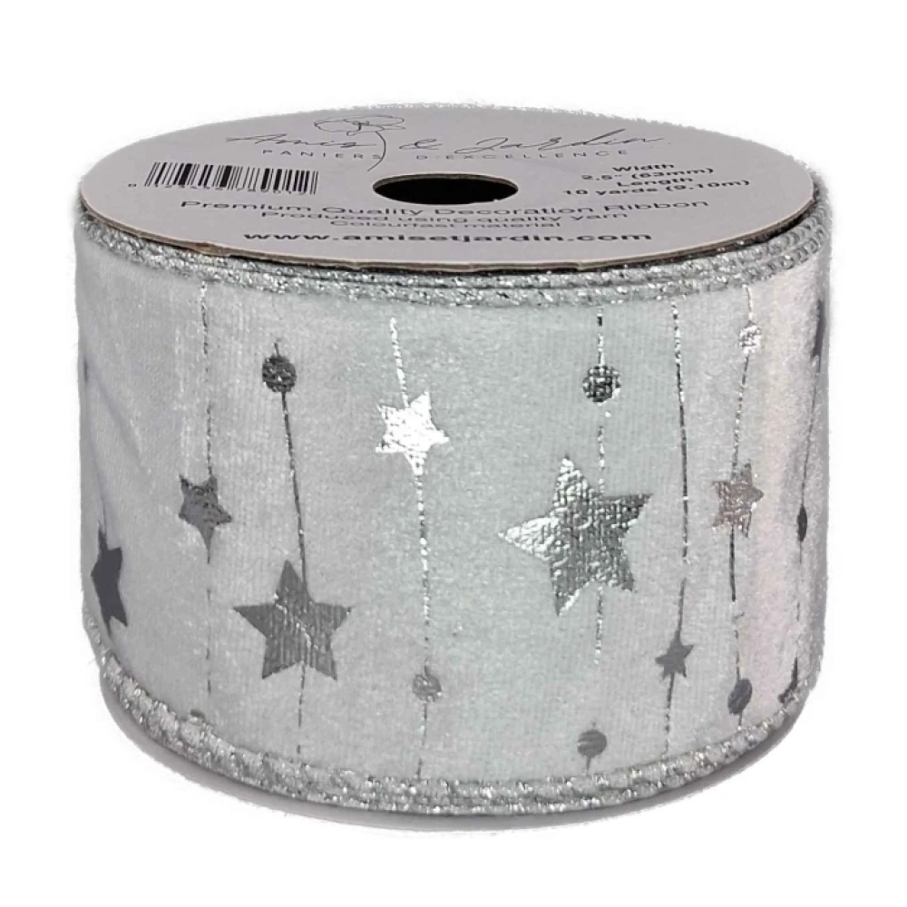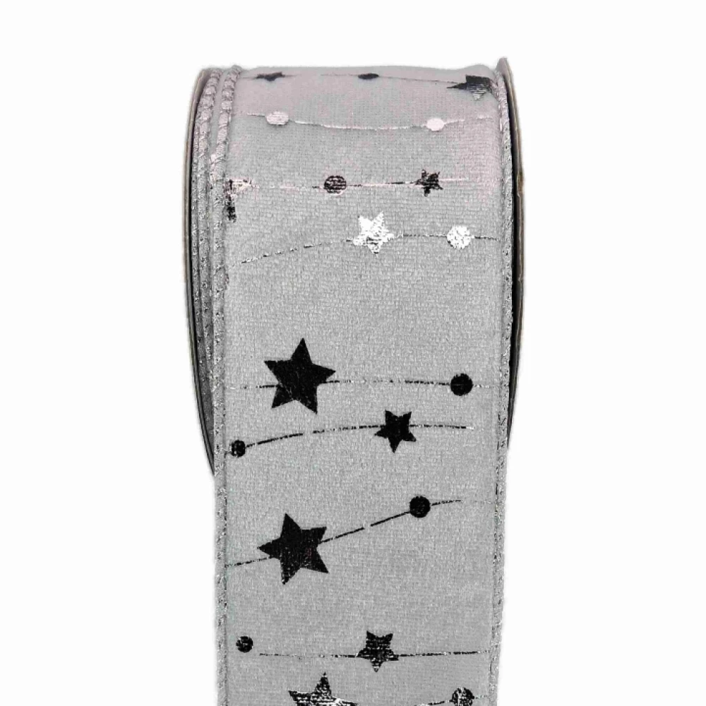 Stuha sametová s drátkem bílá zimní hvězdy 9.1 m